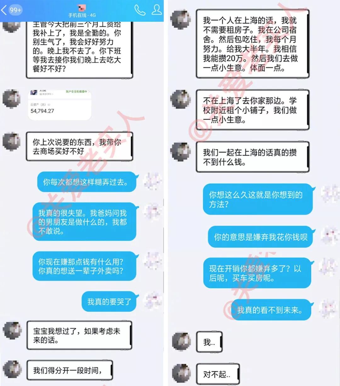 從對話可以得知,這對情侶,在上海租房子居住,兩個人日常開銷每月7000塊,女孩月薪4000塊,而男孩月薪15000塊。