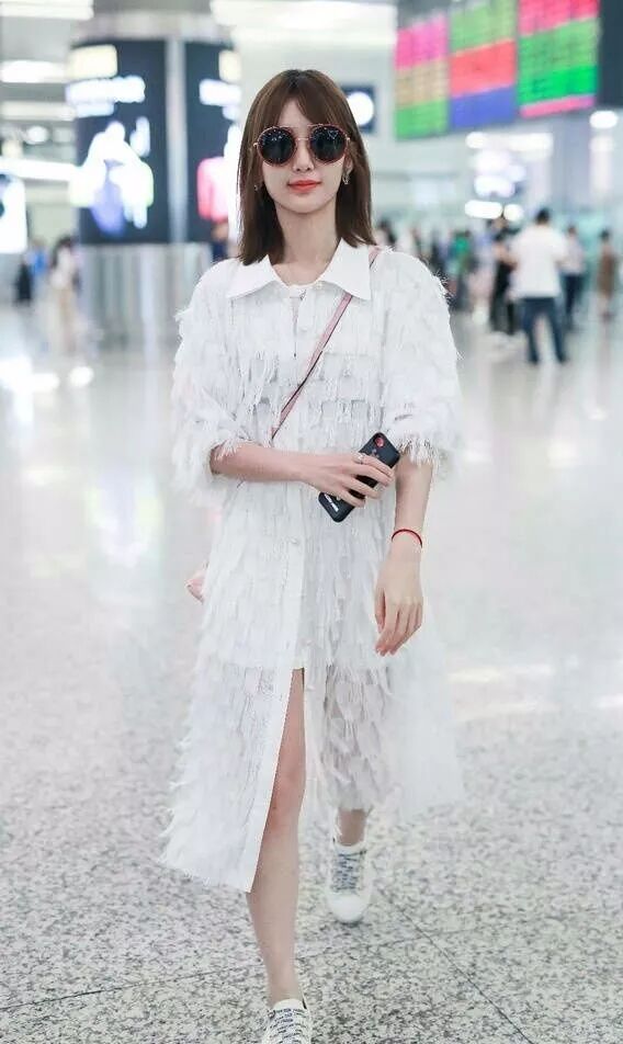 一身的羽毛大衣簡直就是像仙女一樣,內搭的白色長款t恤衫看起來特別的小清新的樣子,非常的適合毛曉彤這樣的小女生
