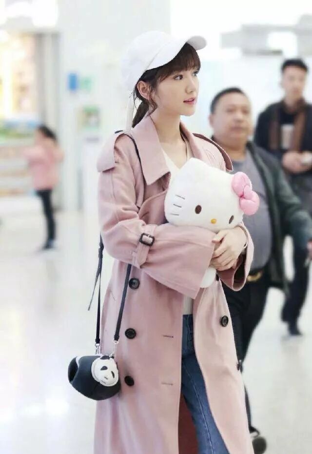 粉色的風衣非常的可愛的,和手上抱著的hellokitty簡直是完美的搭配,挎著的黑色的小包也特別的可愛很有個性了