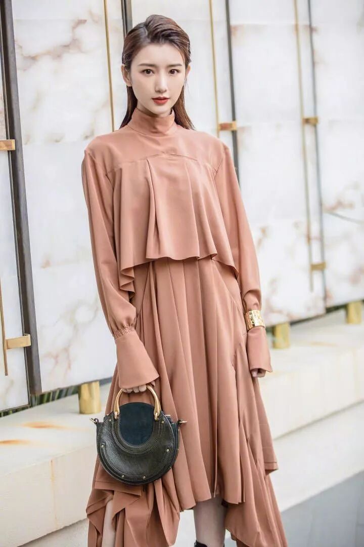 頭髮全部梳在後面看起來簡直霸氣十足了,橙色的長裙非常的有個性是非常的不規則的那種,看起來也很時尚了,比較會挑衣服