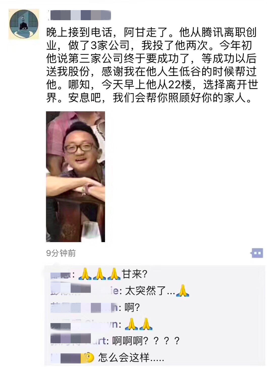 騰訊前員工阿甘,從騰訊離職後自主創業,做了3家公司,在第三家公司即將創業成功的當口,他卻突然從22樓跳下,離開這個世界。