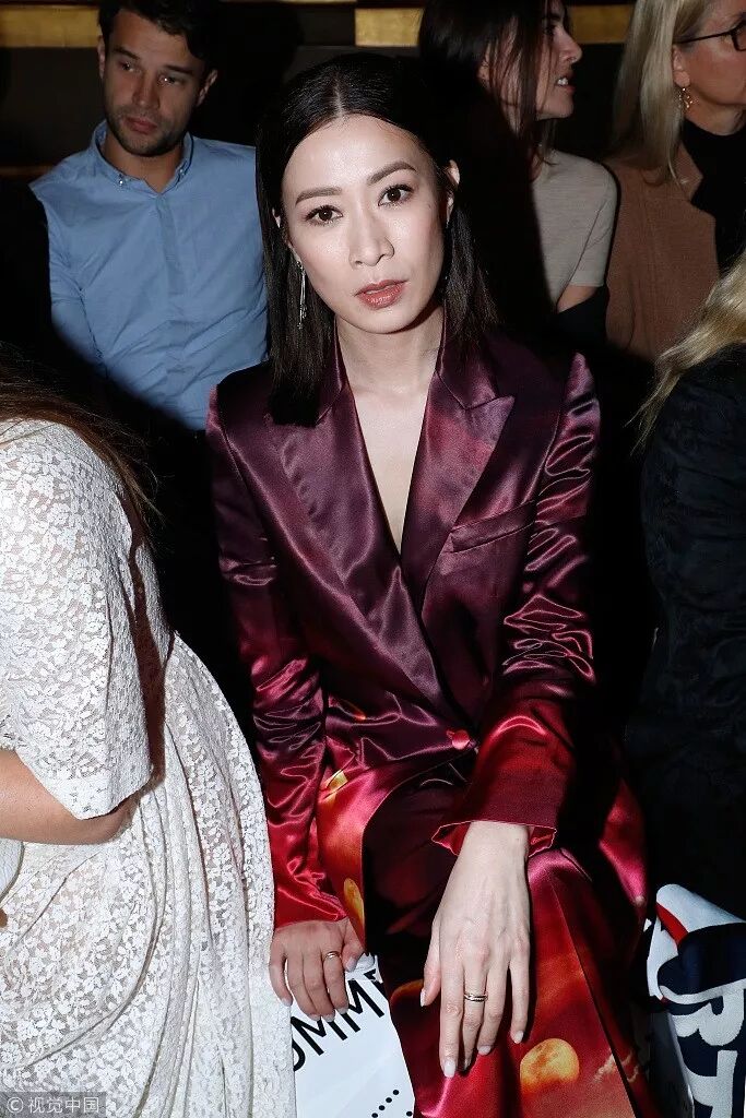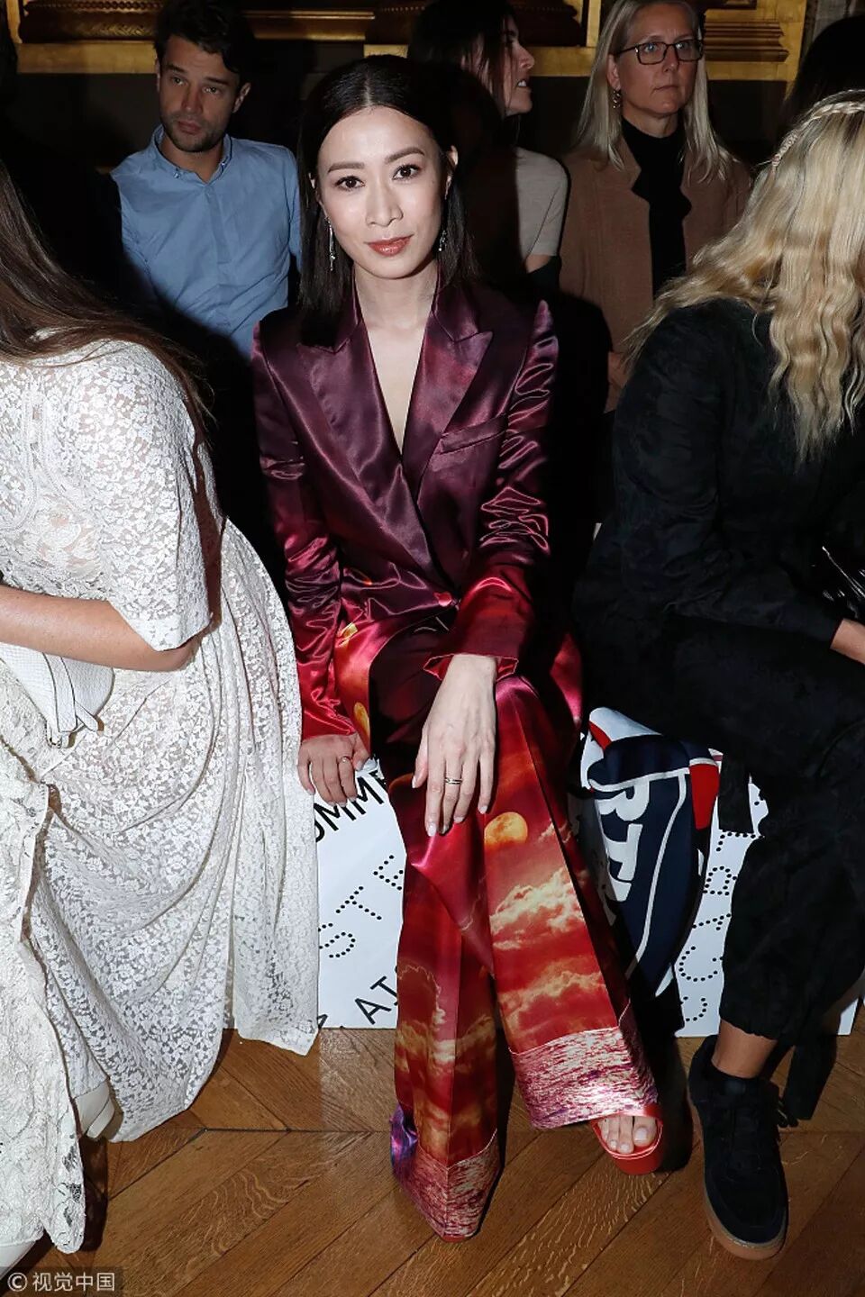 嫻妃佘詩曼身穿酒紅「睡衣」套裝現身Stella McCartney秀場,嫵媚動人、韻味十足。