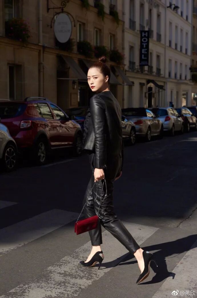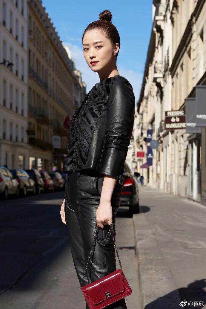 蔣欣一身黑色褲裝亮相Akris大秀,修身的款式襯托了完美身材,利落的丸子頭宛若特工女郎。