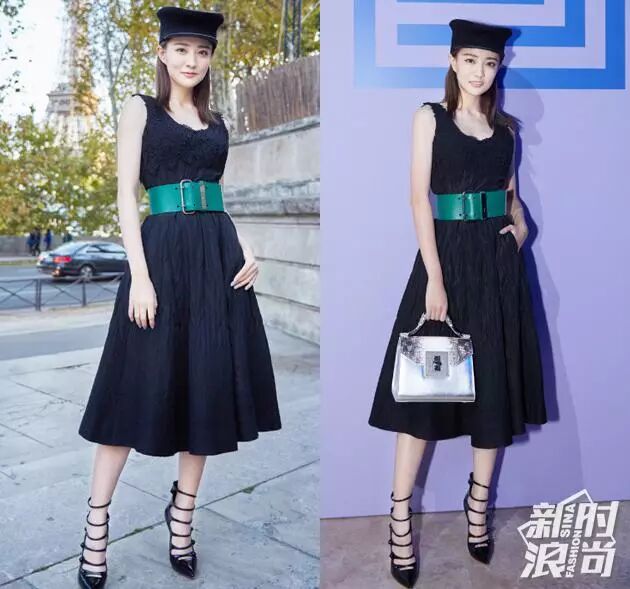 徐璐亮相夏姿陳SHIATZYCHEN 2019春夏大秀,身著黑色無袖連衣裙,絨布材質與毛料拼接,低調中盡顯優雅。綠色寬皮腰帶和銀色玉鐲提包加身點綴,時髦個性又婉約復古。