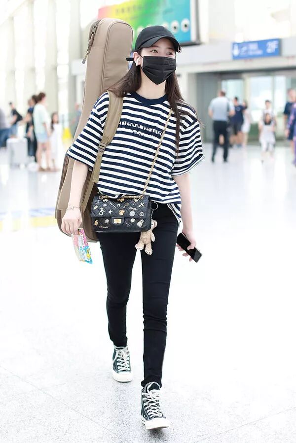 同樣是修身牛仔褲的歐陽娜娜,條紋T+黑色修身牛仔褲,這腿是服氣的。