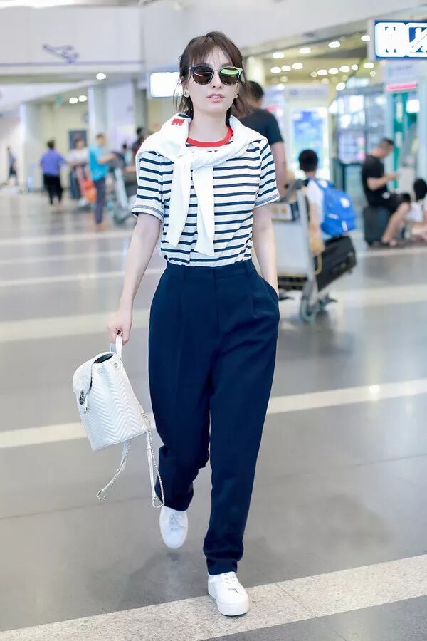 吳昕也是和王菊一樣相比短褲更適合闊腿褲的穿搭。條紋T搭配藏青色闊腿褲和小白鞋,外套隨意的掛在脖子上還凹了造型,這套不錯哦。