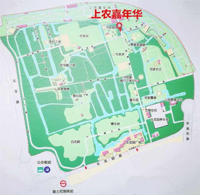 地鐵線路:軌道交通11號線終點站迪士尼站,3號口出,沿生態園路直行200m光明生態園(原申迪生態園)在您左側,上農遊嘉年華處於光明生態園內部。