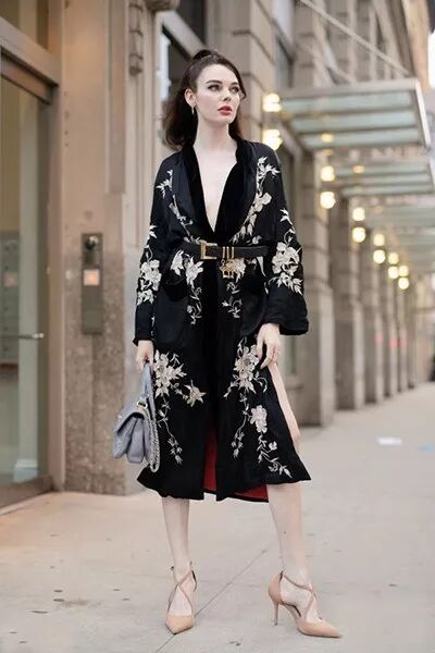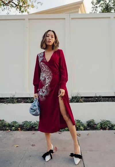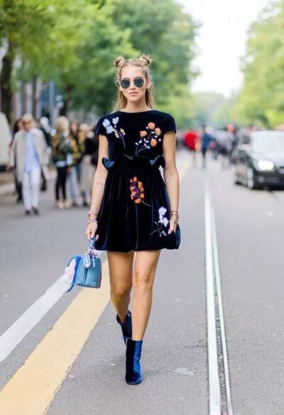 高跟鞋搭配刺繡款的絲絨連衣裙會讓你的個性更加鮮明,選擇刺繡款可以參考那些時尚博主上身的那些抽象藝術或是植物、動物之類的。