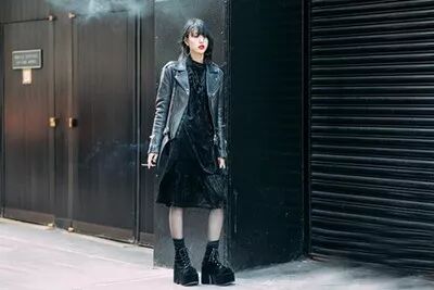 在絲絨裙外搭西服外套或者是皮衣的時候,會有一種酷酷的感覺,與此同時也不失女人味和高級感。