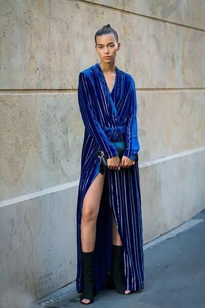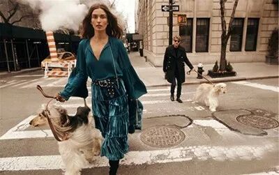上圖中超模Andreea Diaconu上身的Michael Kors孔雀藍絲絨裙,看一眼就覺得氣質非凡,V領長袖的設計,在風中飄逸的亞光。