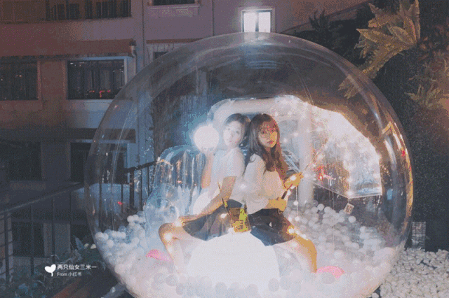 對了對了!泡泡屋有很多發光的小道具:會變色的發光球、掛滿小彩燈的傘、還有一串發光的小燈泡,大家白天去和晚上去能拍出兩種不一樣的感覺~