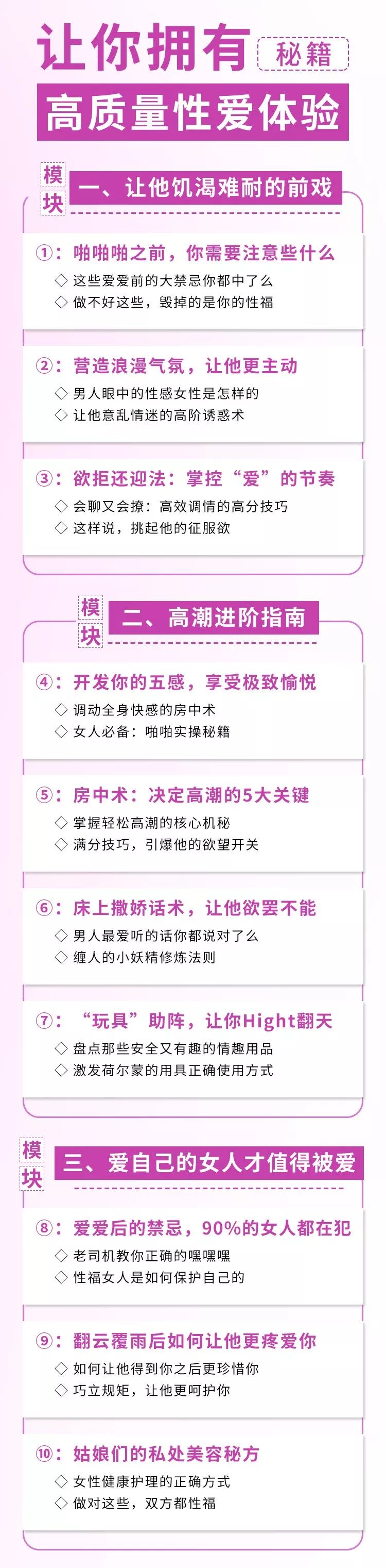 由金牌女性魅力重塑導師程可精心打造《讓你擁有高質量性愛體驗的秘籍》全面為你解鎖性愛秘密,體驗別致性福!