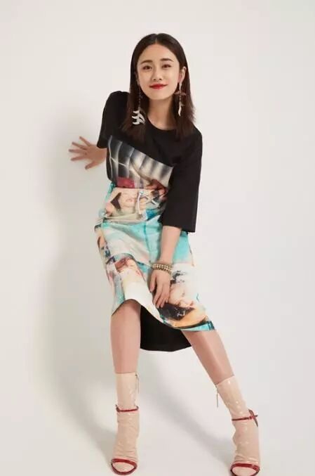 黑色圖案T恤搭配彩色的半身裙,顯得十分潮流前衛。腳上的塑膠設計的紅色綁帶鞋十分有特色,整體看起來甜美卻不乏時髦新潮。