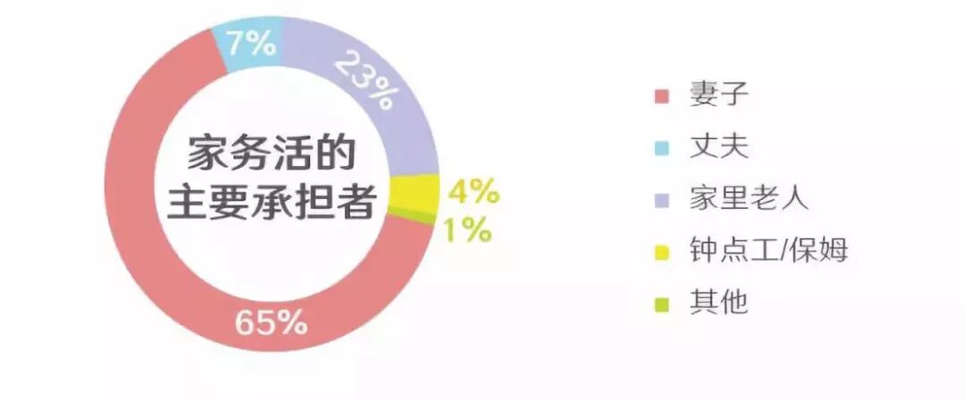 中國女性每天的家務勞力時間達到2.6小時;妻子以65%的壓倒性占比成為家務活的主要承擔者。