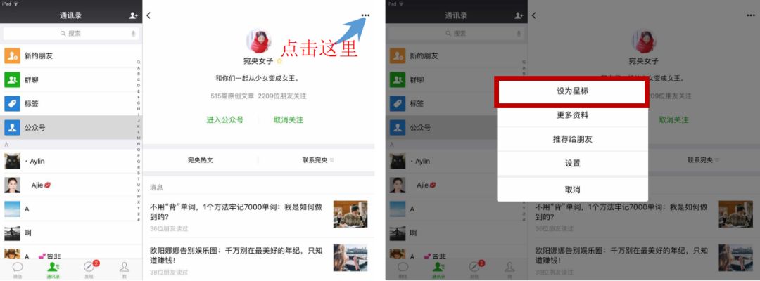第一步:找到公眾號「宛央女子」,點擊圖片所示三個小點點,會出現右邊所示。第二步:選擇「設為星標」。