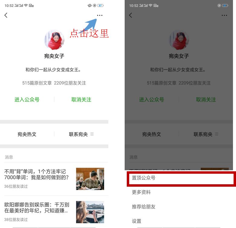 第一步:找到公眾號「宛央女子」,點擊圖片所示三個小點點,會出現右邊所示。第二步:選擇「置頂公眾號」。