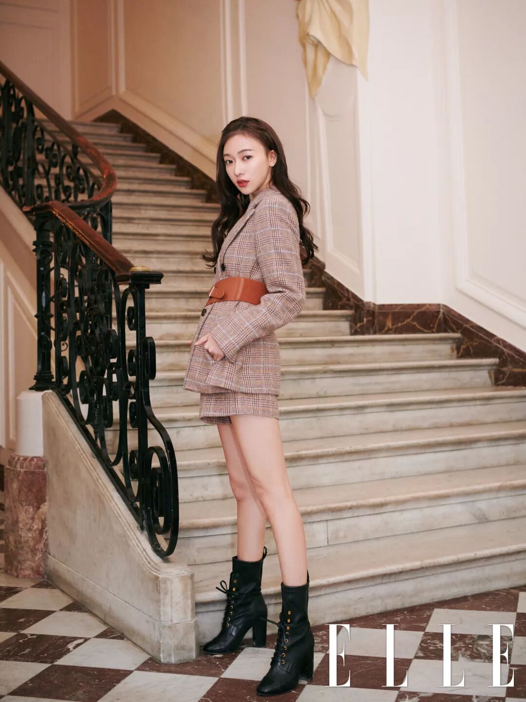 在法式少女的穿著中攫取靈感,嬌媚的花朵也可以酷勁十足,夜晚不想被忽略,那麼別致又溫柔的駝灰色格紋套裝是很棒的選擇,腰帶作為加分項,不僅勾勒出盈盈一握的小蠻腰,更能調整整體比例,配合酷勁十足的黑色短靴,這就是專屬謹言的法式浪漫造型。