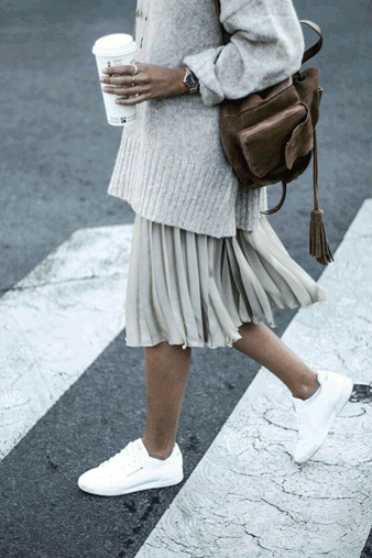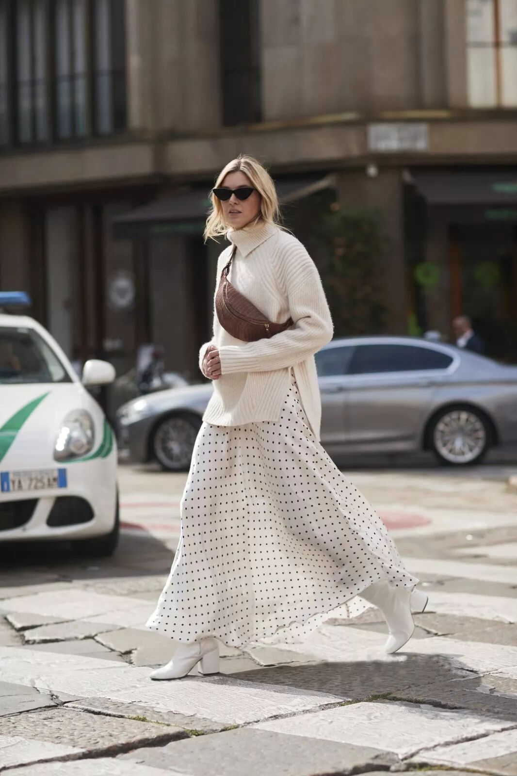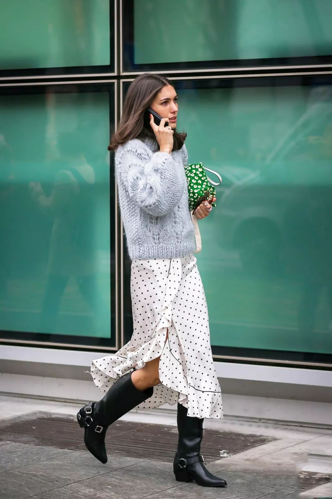 溫度再低點,還可以將裙子換成秋冬的絲絨毛呢等等材質,一個搭配套路貫穿早秋到深冬。