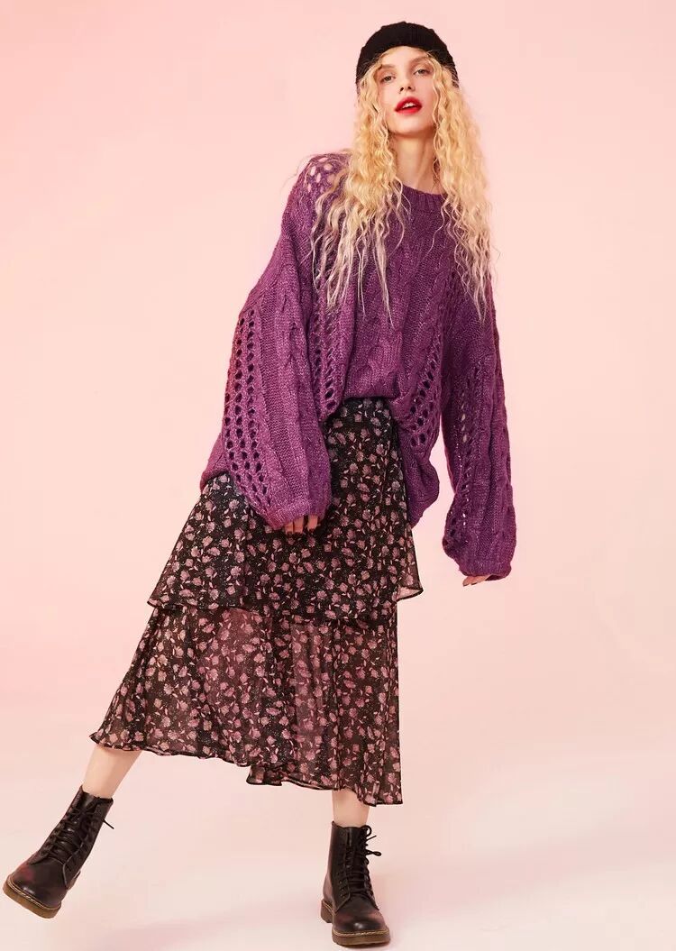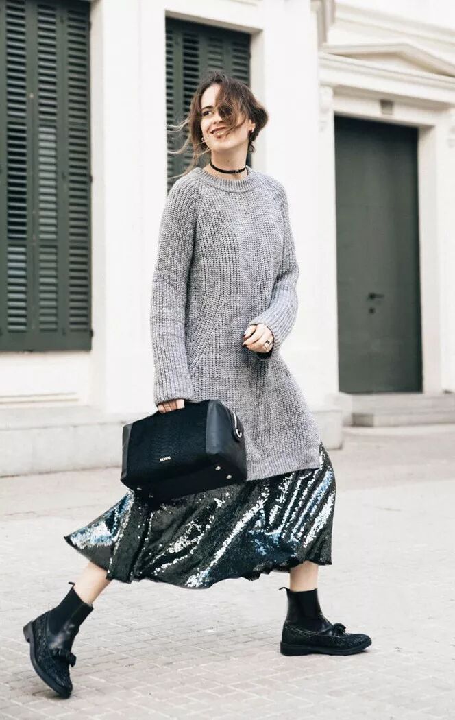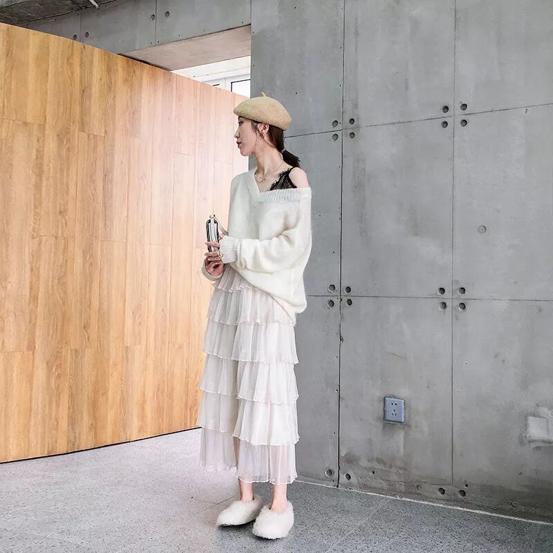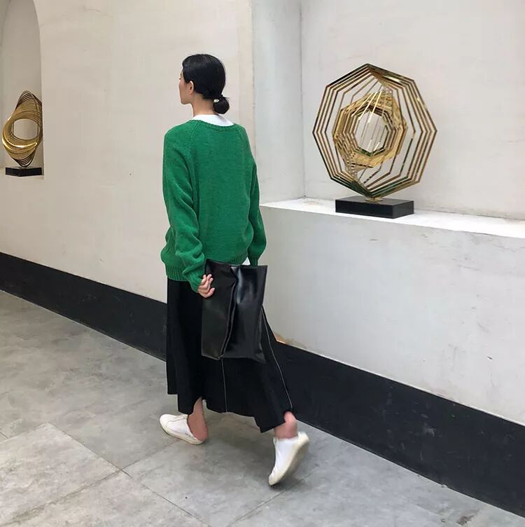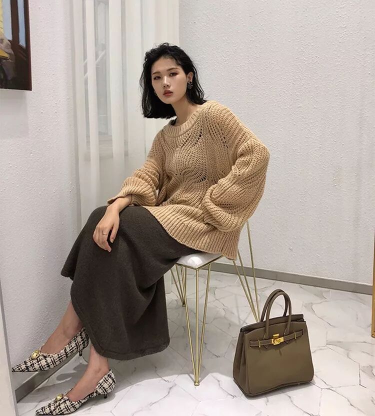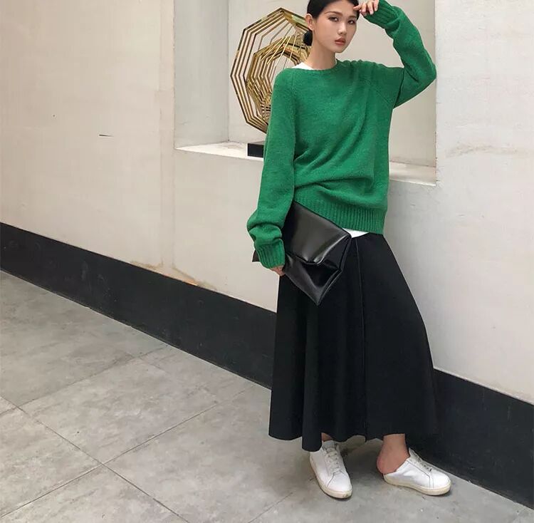 而且套頭中長款針織衫搭配半身裙的時候,遮蓋了寬胯、粗腰、粗腿的問題,不僅氣質還顯瘦。你說,這樣的穿搭怎麼不讓蘋果型身材的寶寶激動。