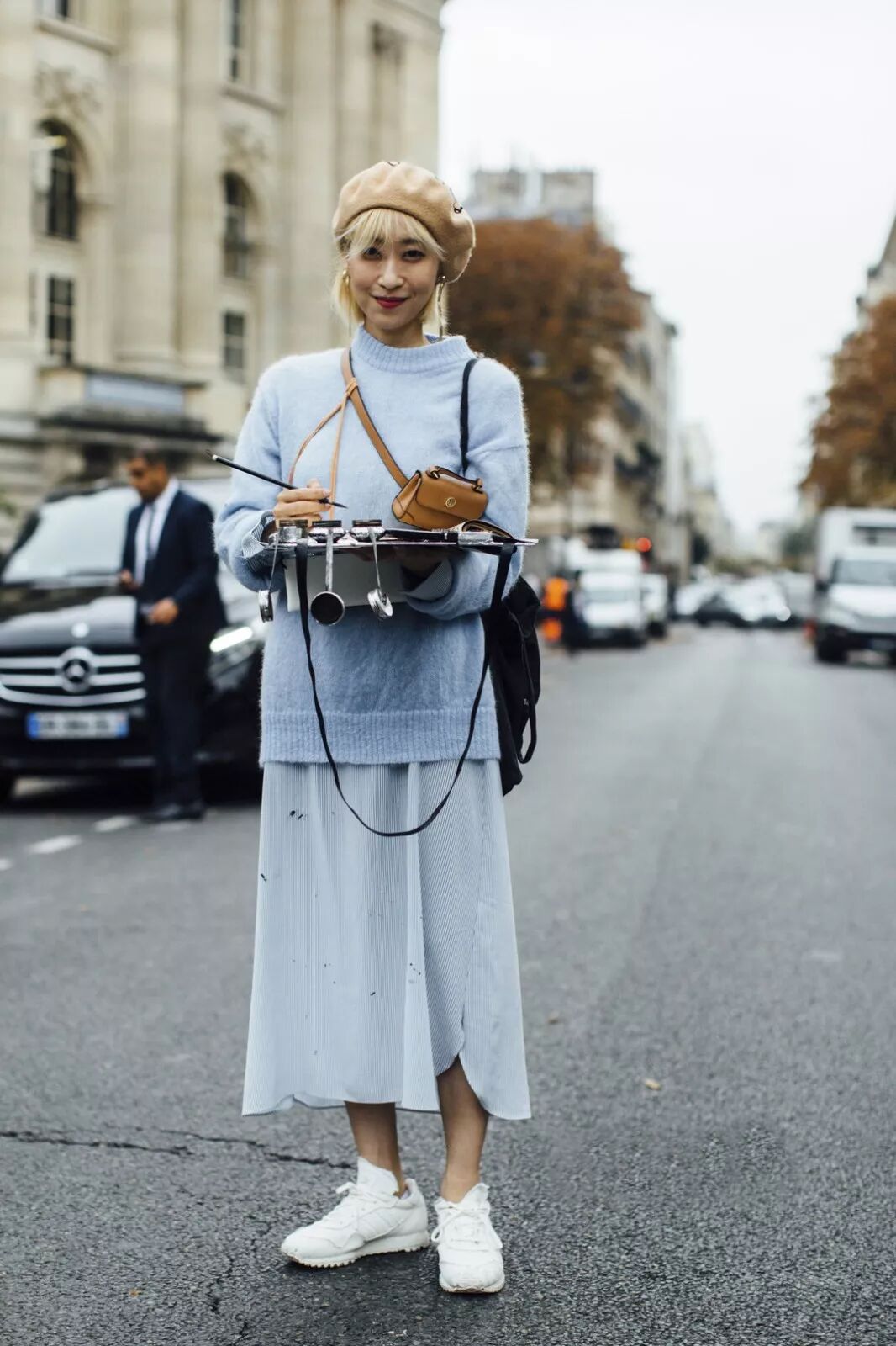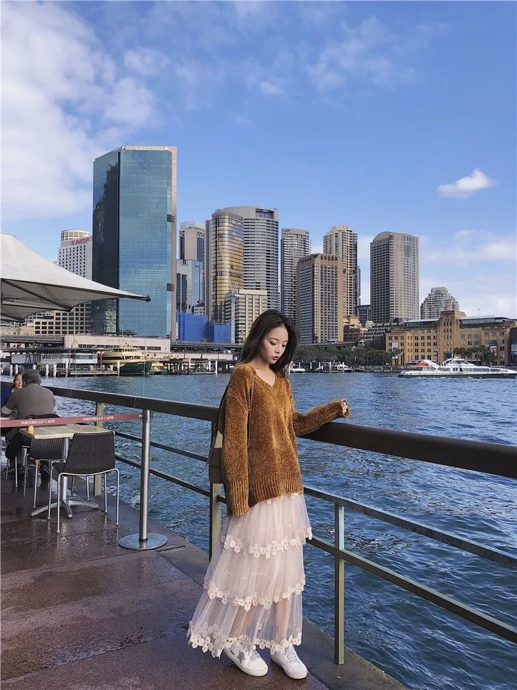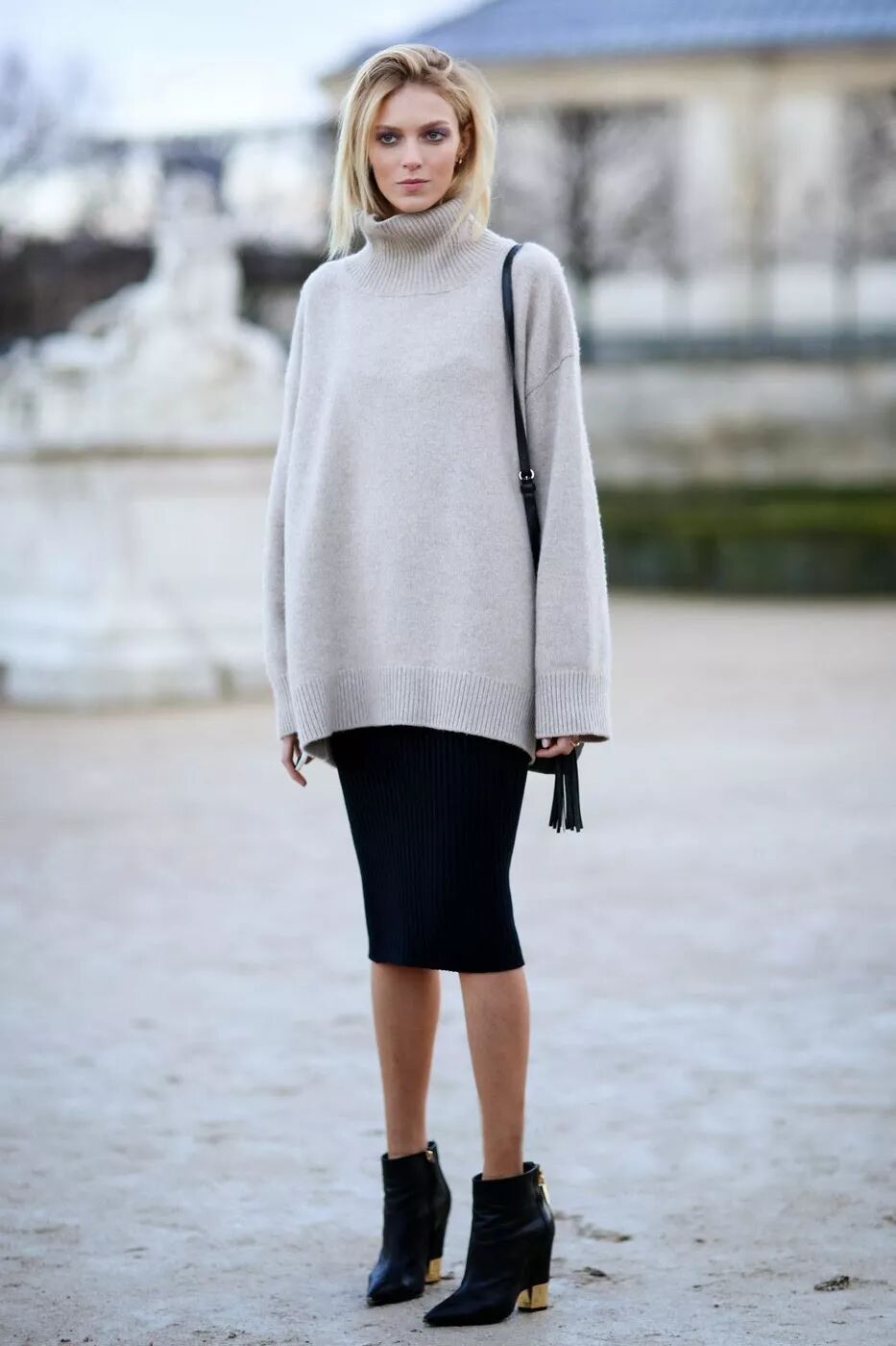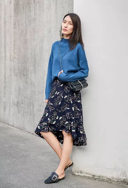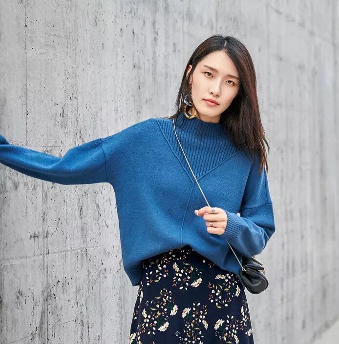 煙管領套頭針織+裙子,更適合脖子怕冷和短脖星人。稍稍留出一點脖子,更顯臉小和身高。