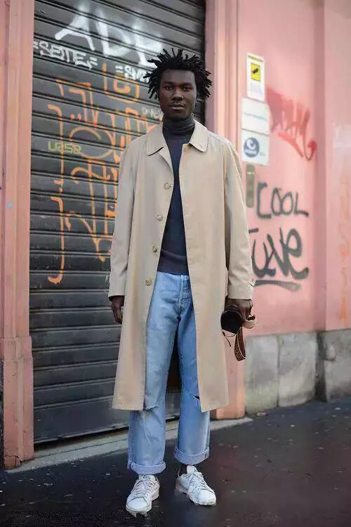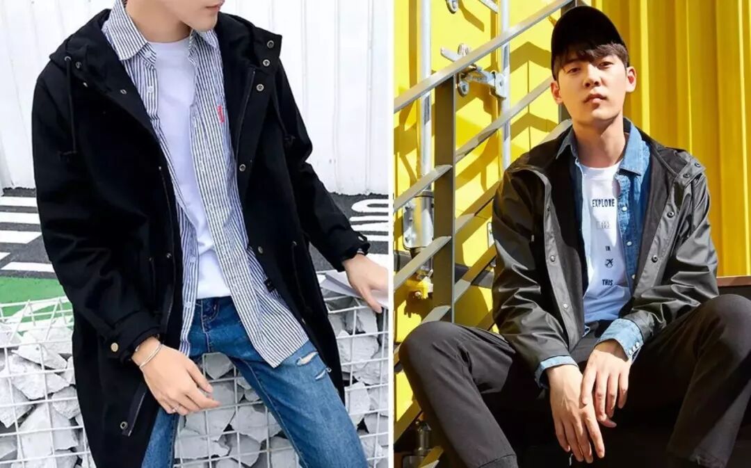 男生推薦風衣+水洗棉質襯衫或牛仔襯衫+T恤+牛仔褲+棒球帽+板鞋或高幫運動鞋的搭配組合。少年感強,商務感弱,鮮少與西裝搭配。