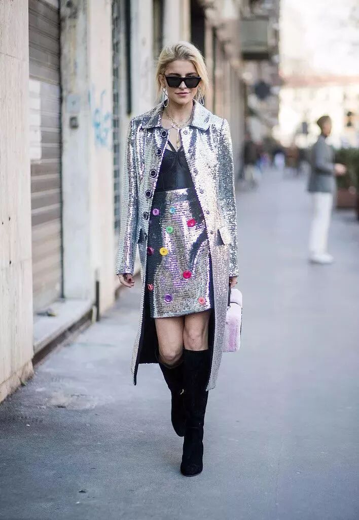 長風衣內搭同款短裙,再配上一雙黑色的長靴,閃亮十足的穿搭,這樣的出街造型更加搶眼。這身套裝真的超好看!一身發光blingbling~