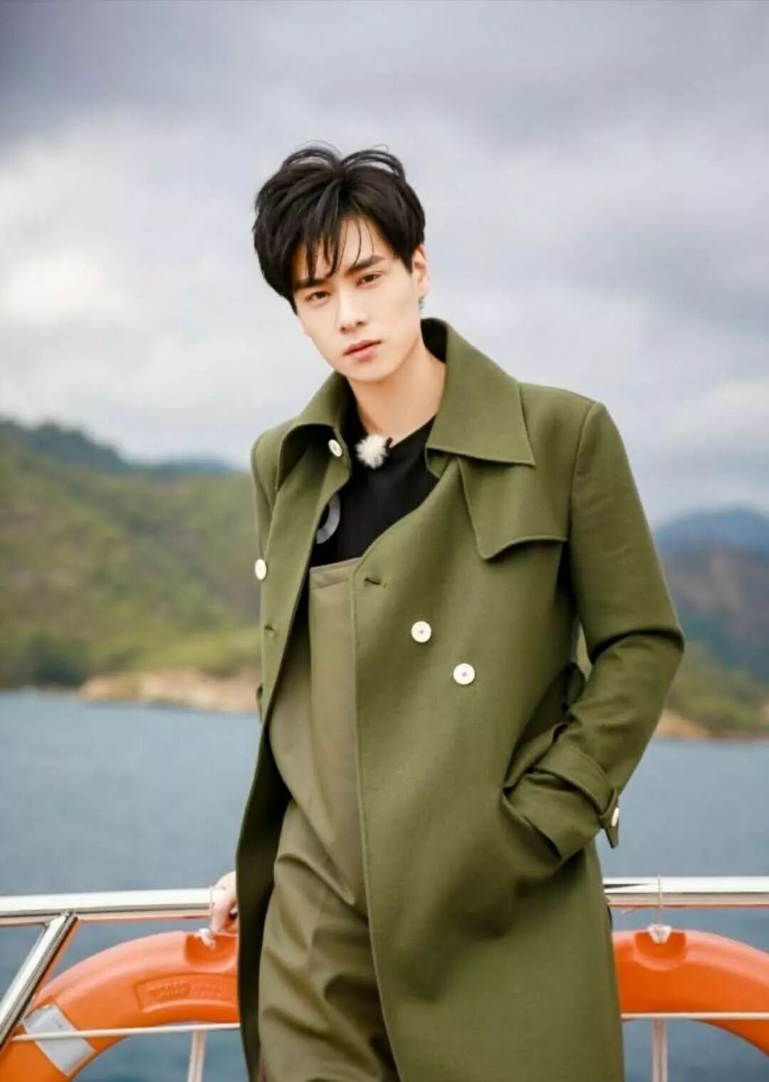 胡一天身穿軍綠色風衣