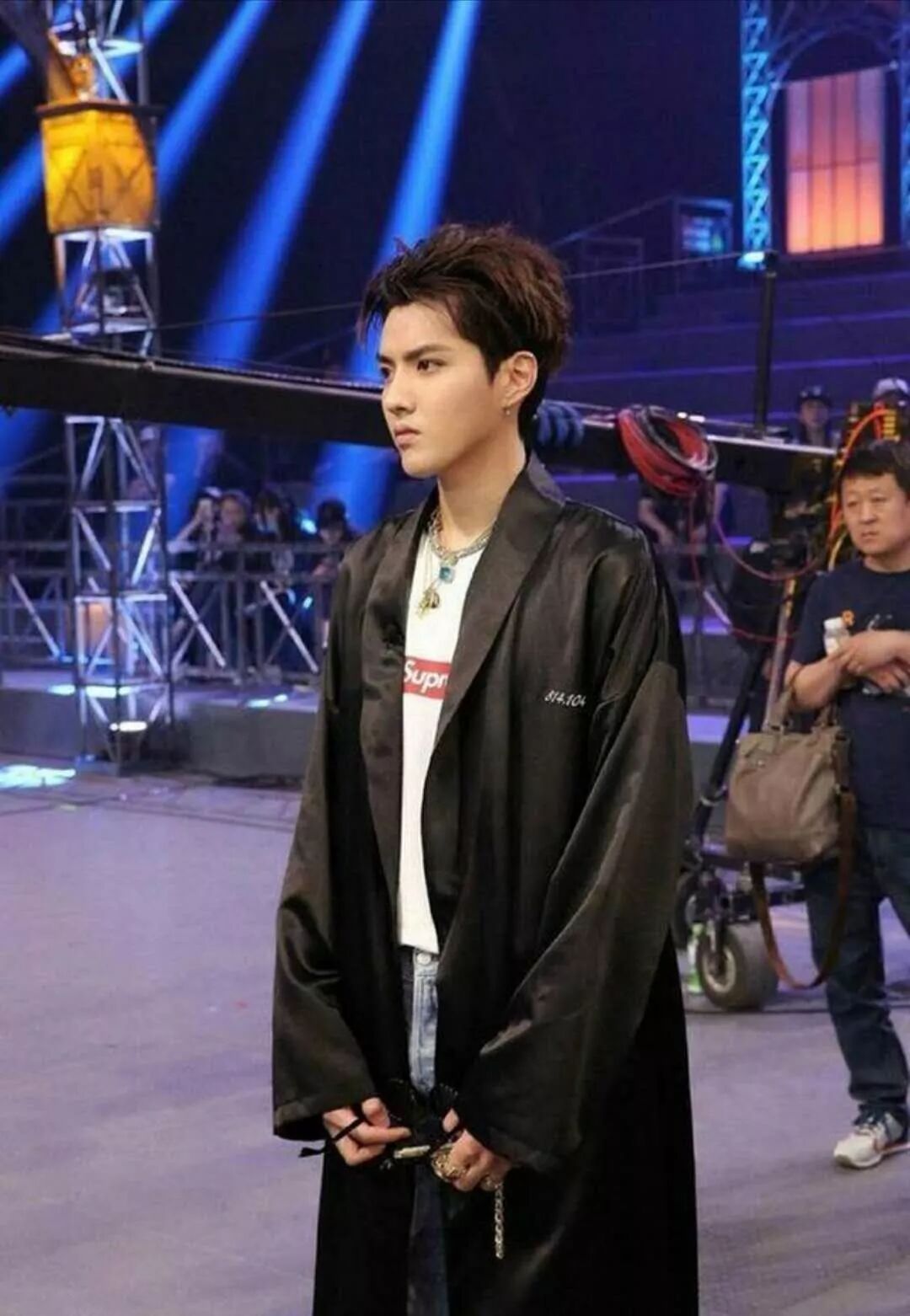 認真工作中的吳亦凡身穿黑色風衣