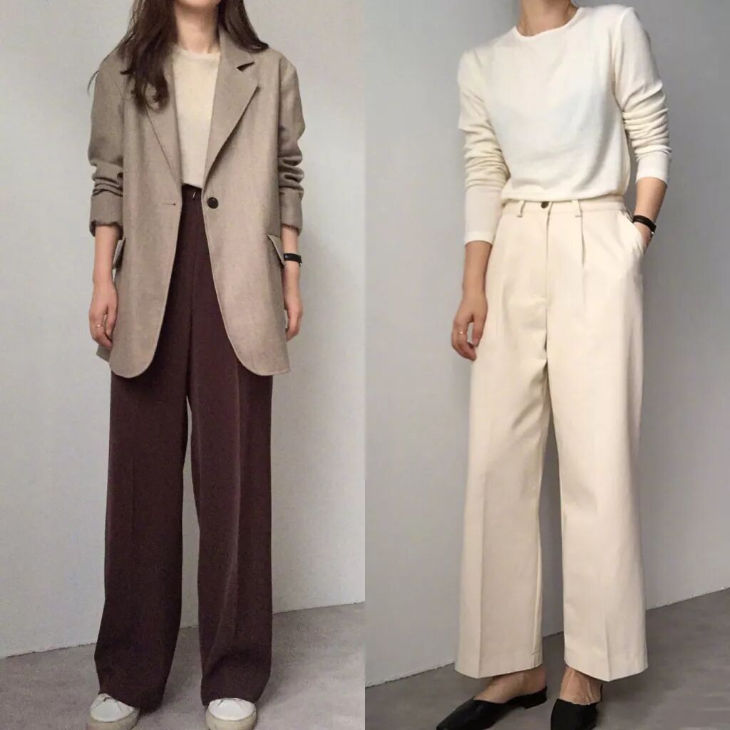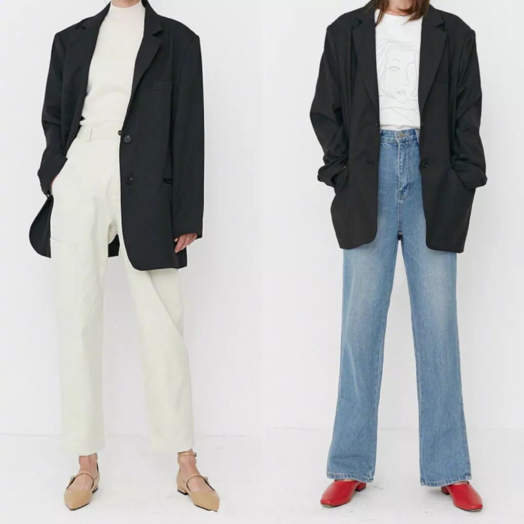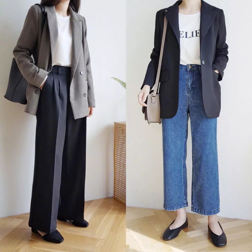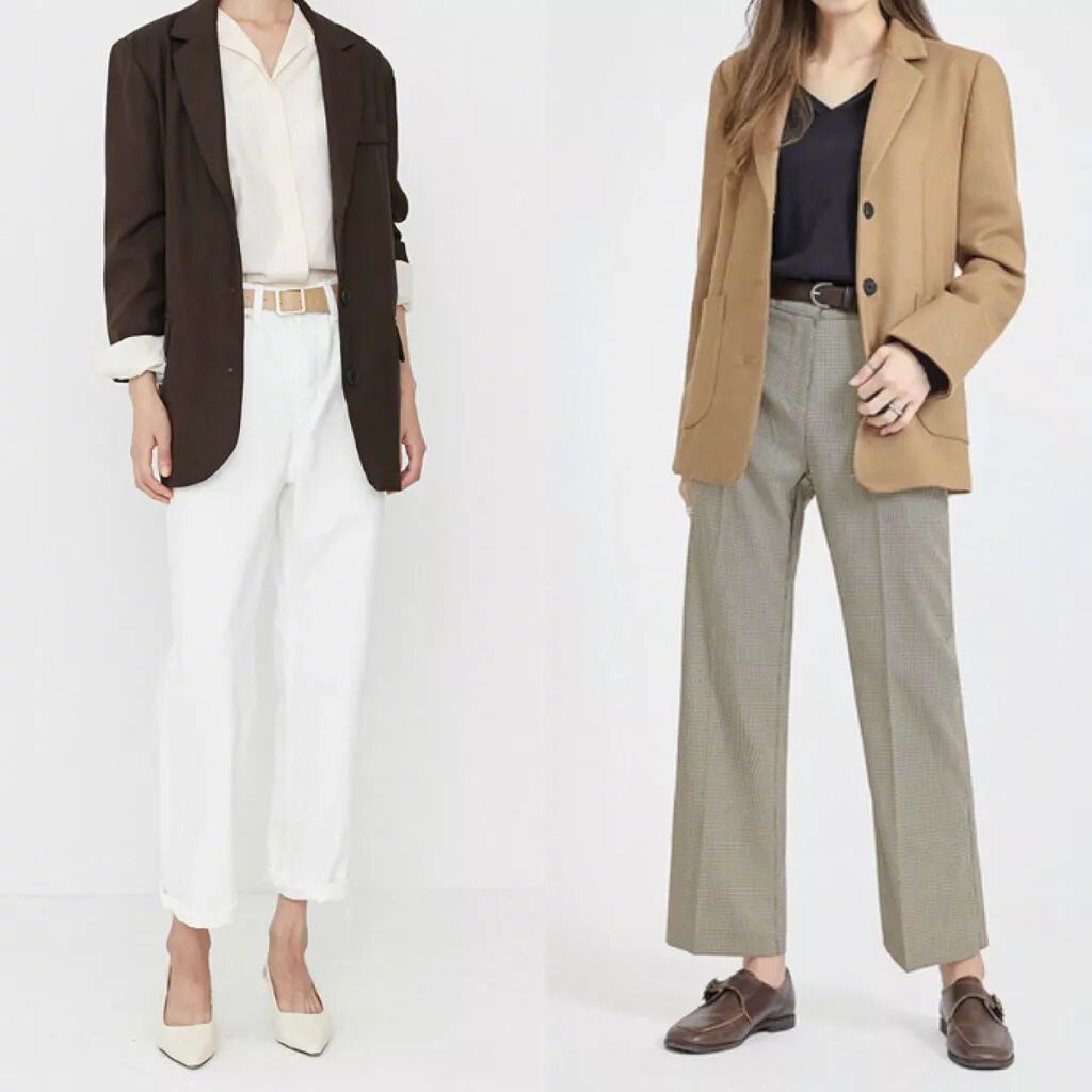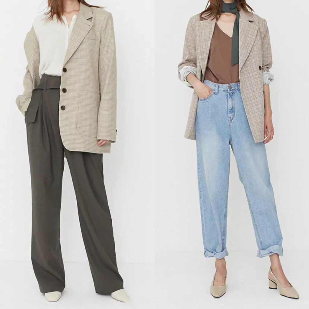 上裝西裝是重點,內搭T恤和牛仔褲,換成襯衫針織和闊腿褲,版型簡單,搭配幹練。
