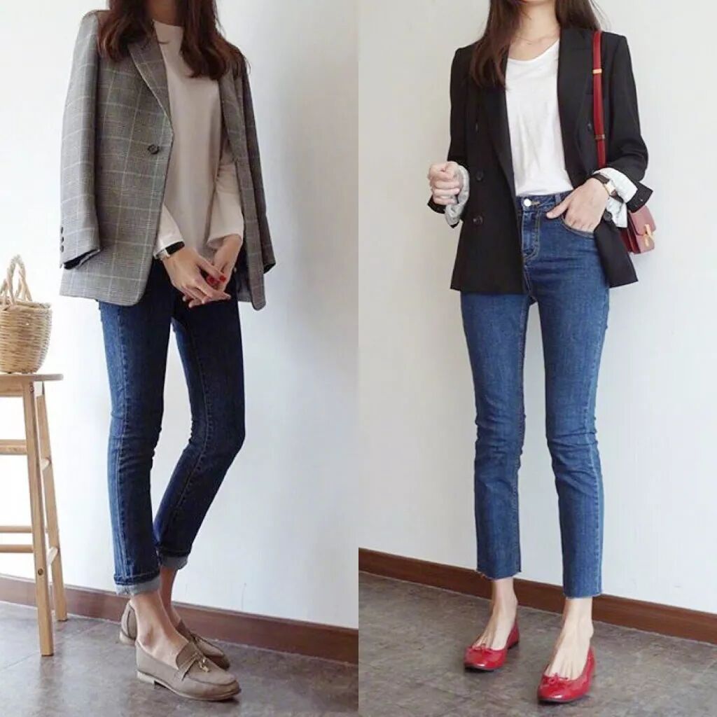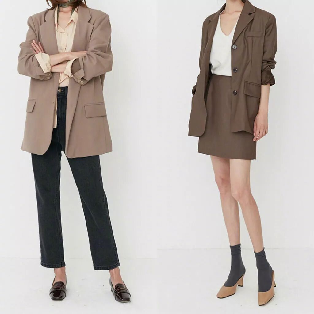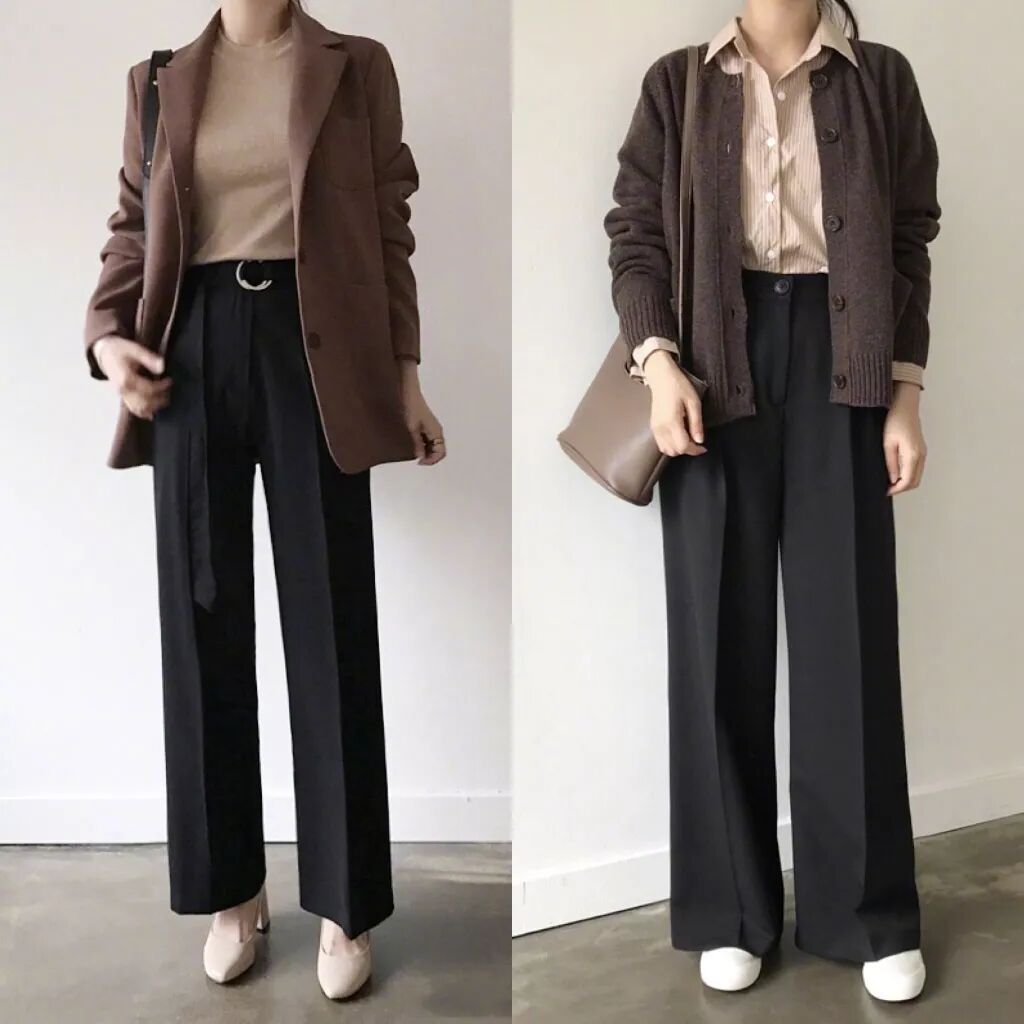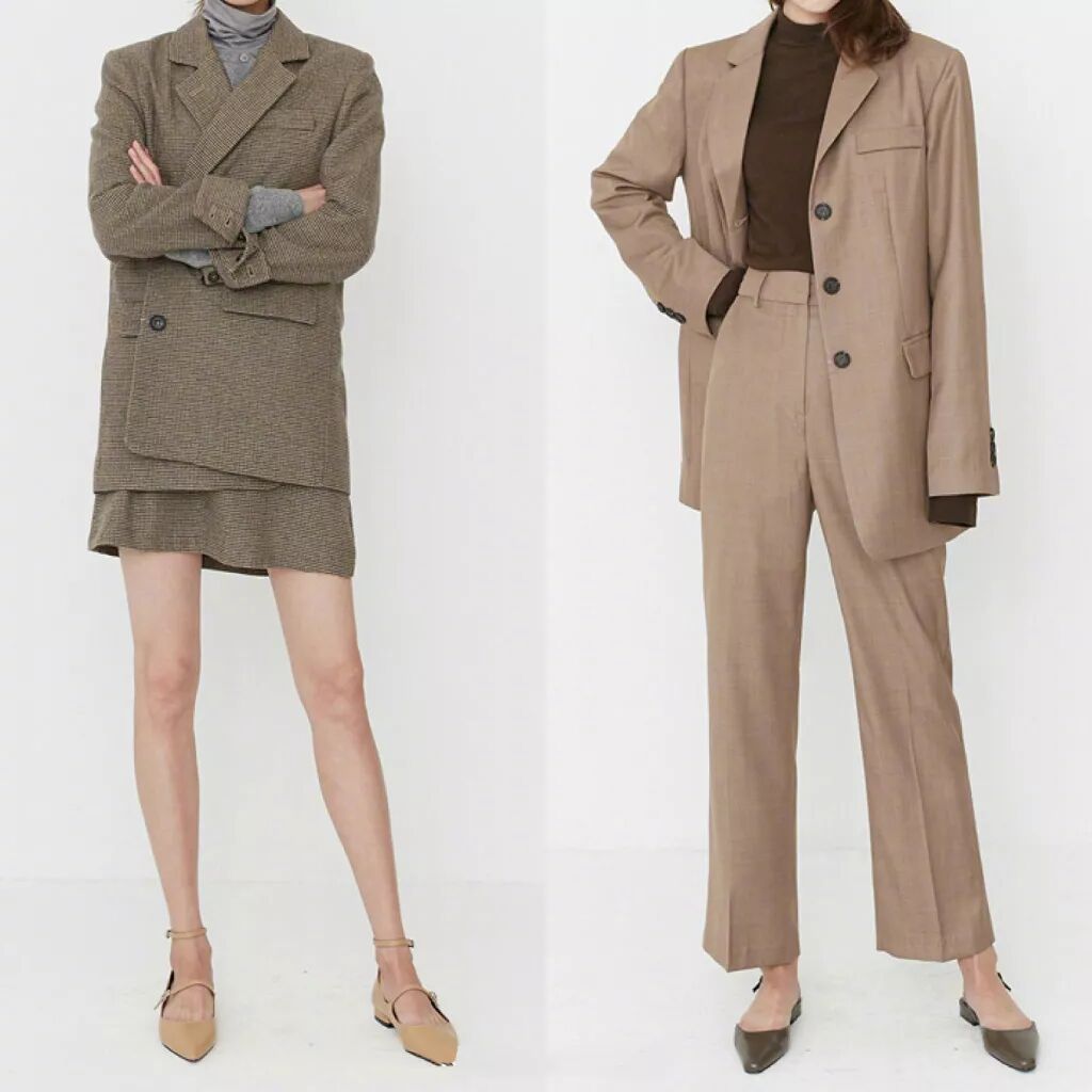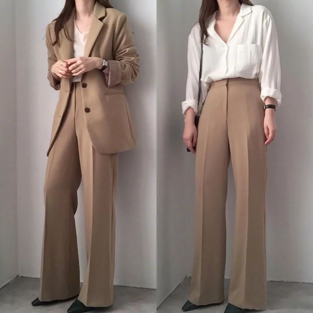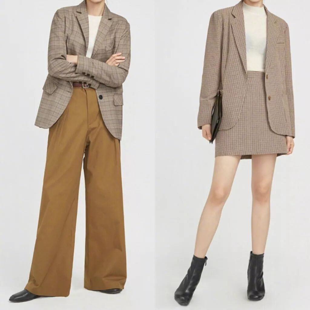 上裝西裝是重點,內搭T恤和牛仔褲,換成襯衫針織和闊腿褲,版型簡單,搭配幹練。