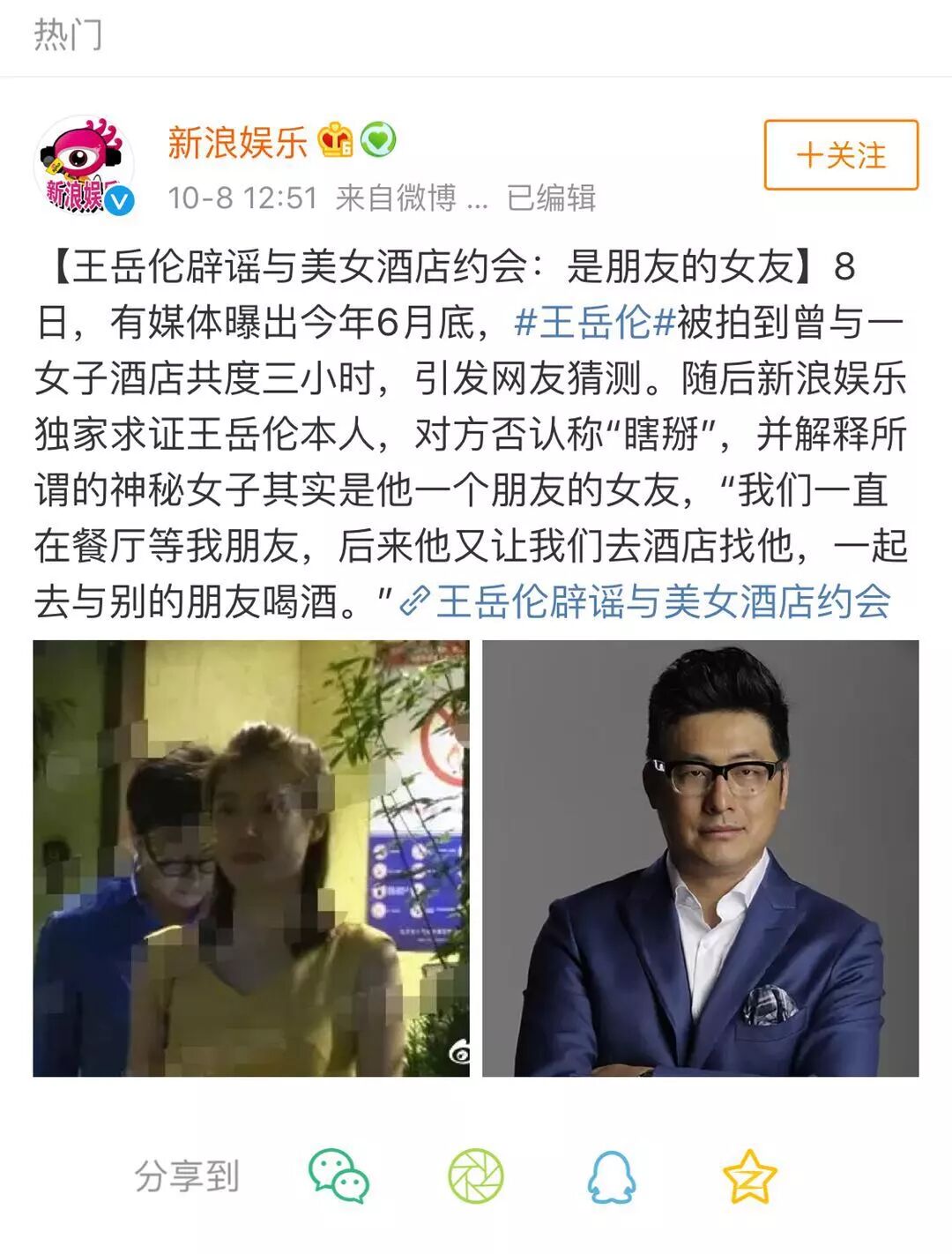 今天微博榜熱搜的第一條是「王嶽倫辟謠」。