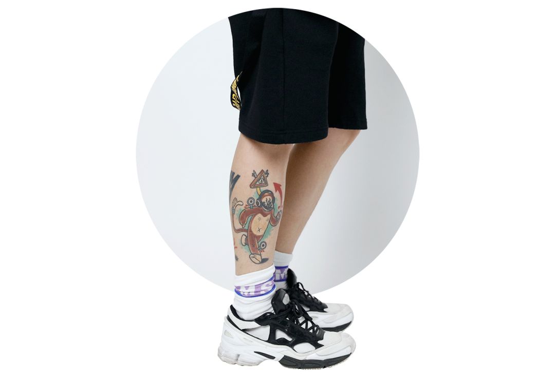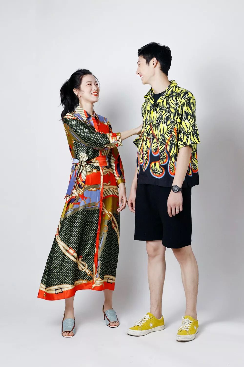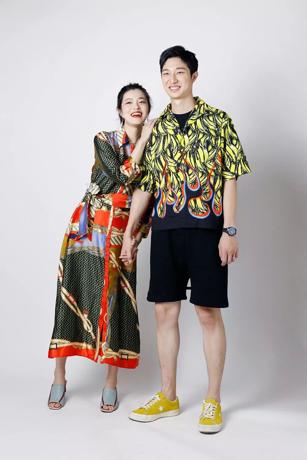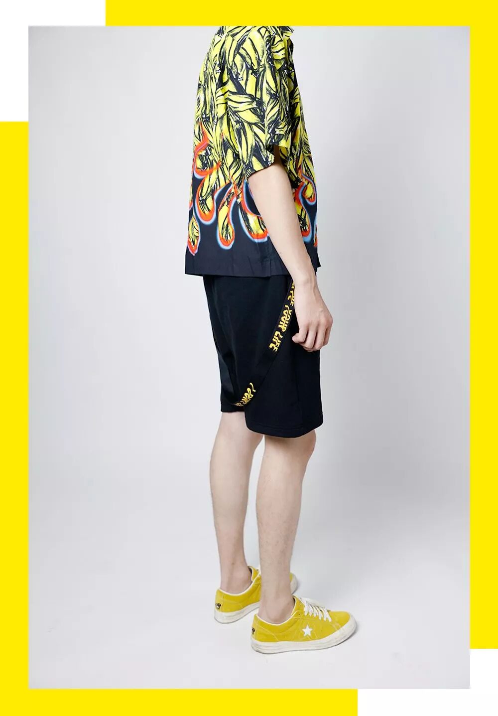 靦腆的Josh在換上這件衣服後就笑成了爛番茄,拍照明顯更放得開了,搭配黑色短褲和黃色板鞋呼應上半身,完美。