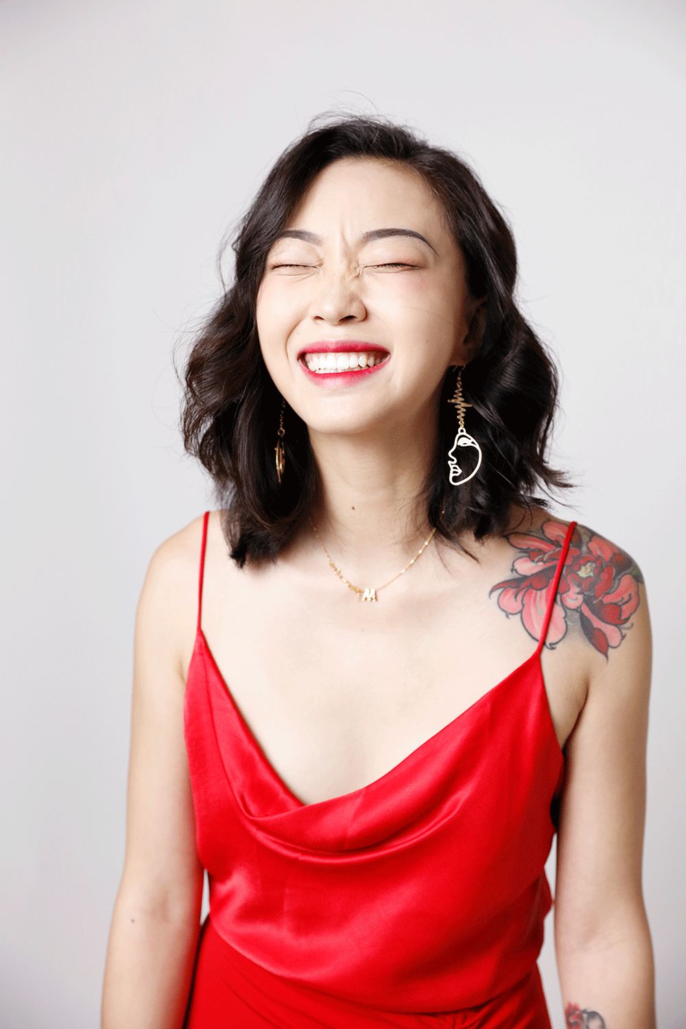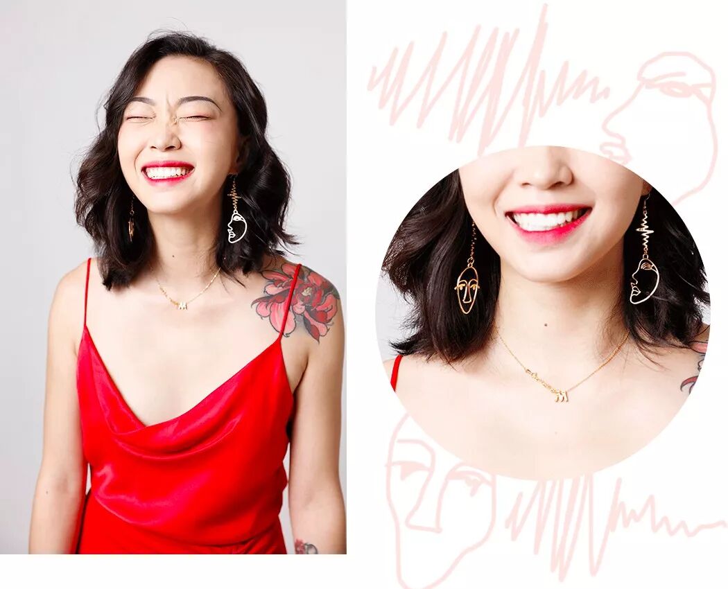 類似畢加索風、設計感很強的人臉耳環平衡過於女人的氣息,