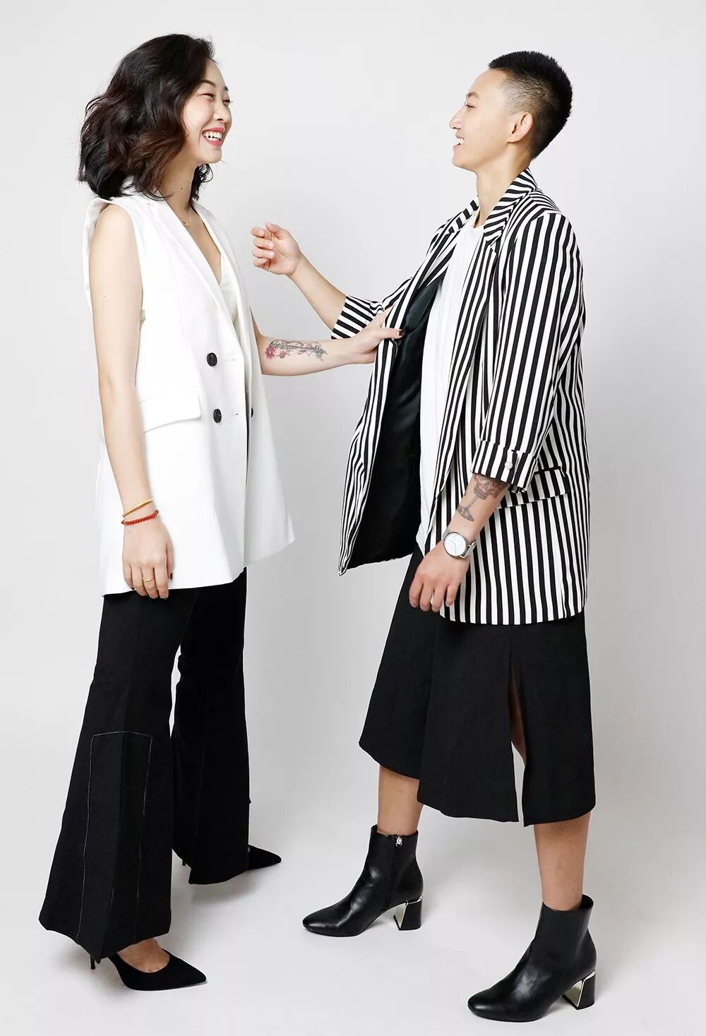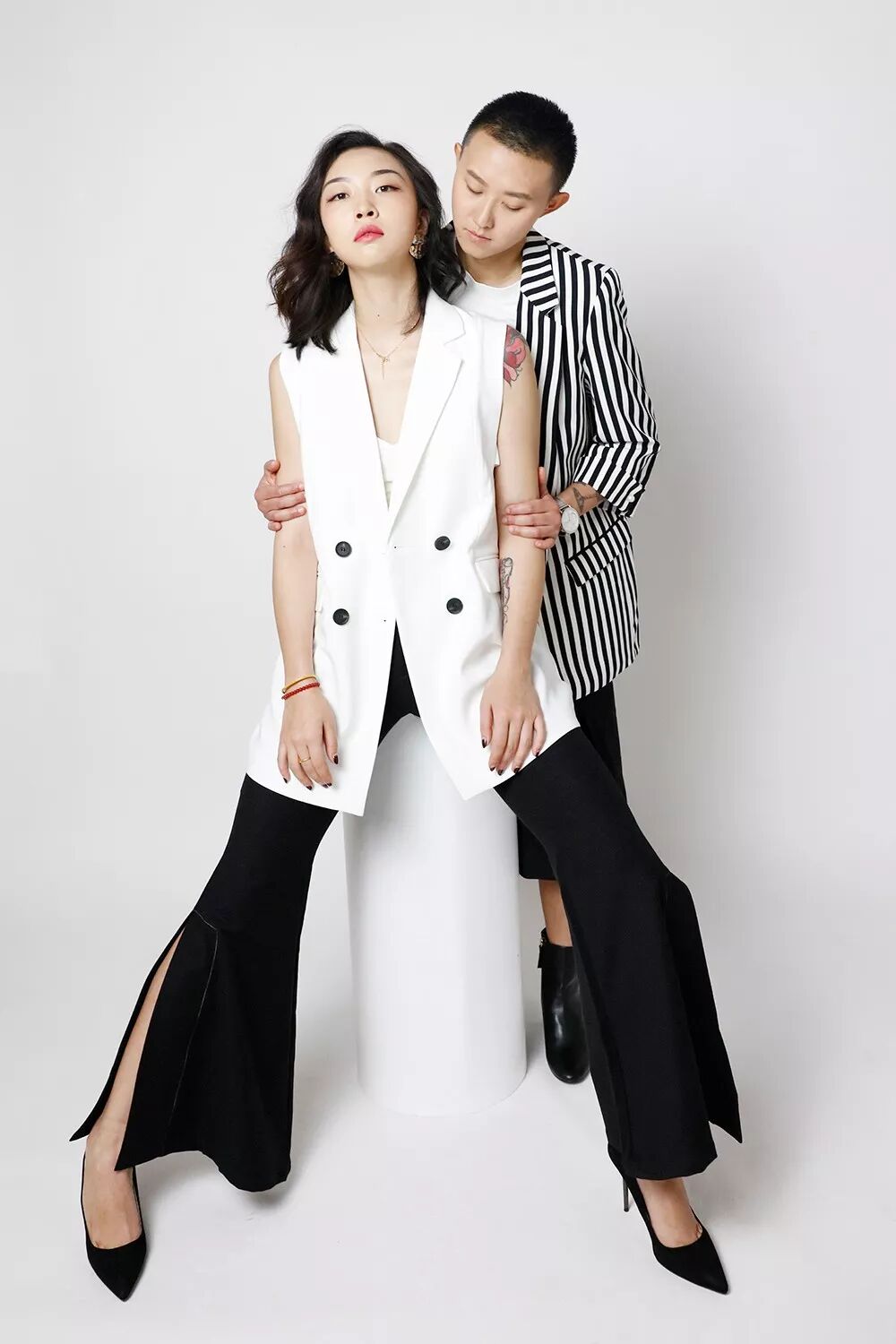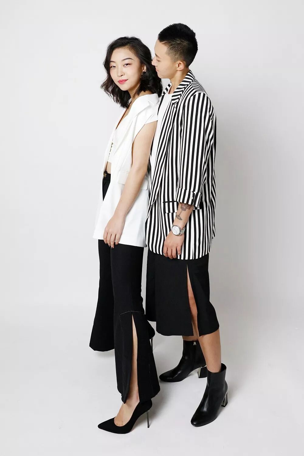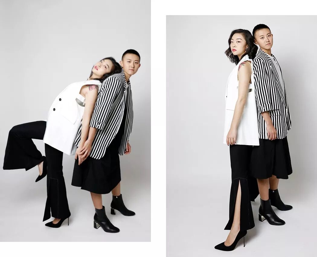 蜜兒一直以來有個小心願:想看這輩子絕對不穿高跟鞋和裙子的女友挑戰不可能。為了不讓蜜兒失望而歸,我給他們搭了套黑白的中性西裝造型: