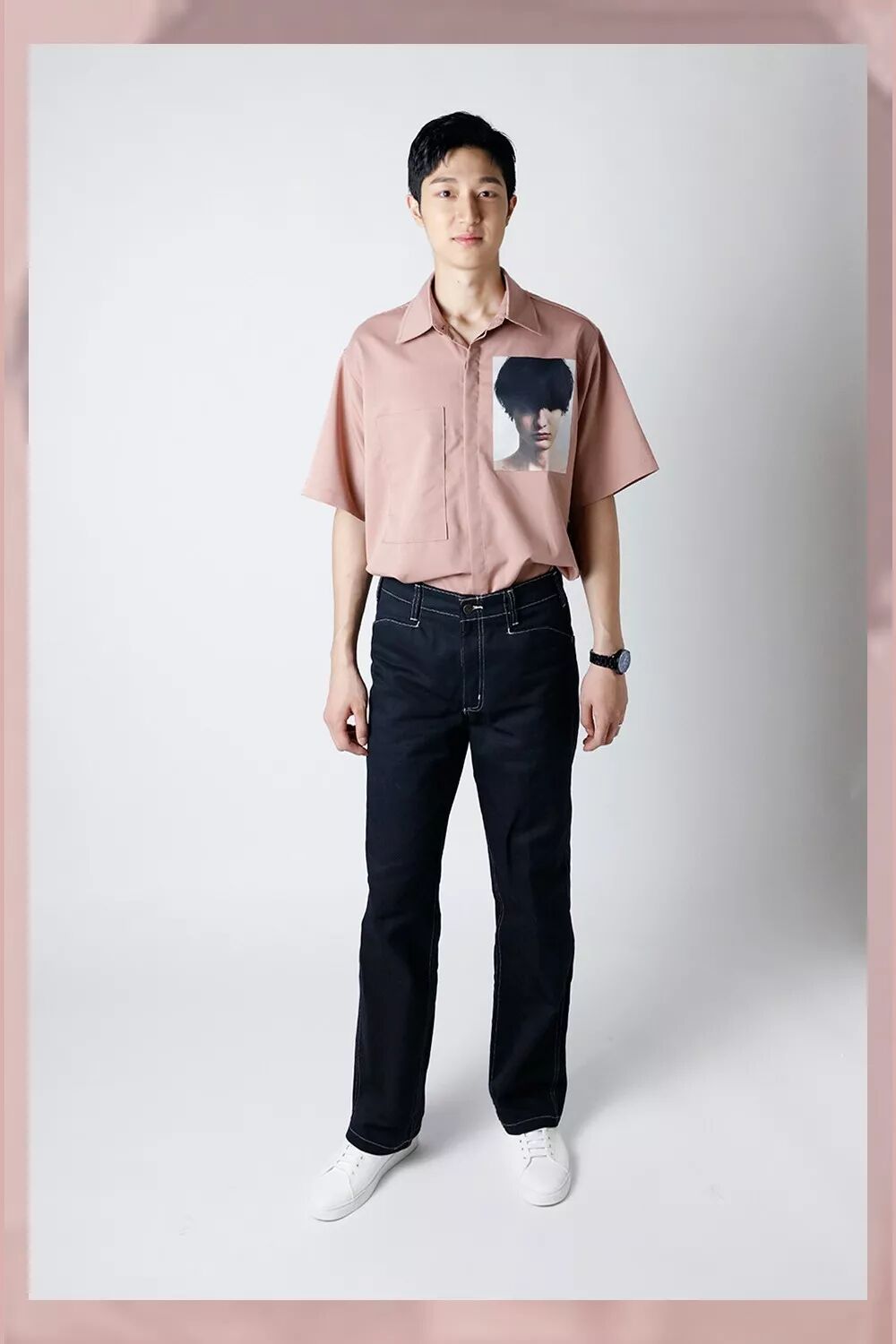 如果下裝規規矩矩穿條緊身九分褲就略普通了,所以宇博給他搭了條明線的闊腿褲,這樣一番捯飭,不敢說能演韓劇男主吧,女主身邊的忠犬男二還是可以安排下的。