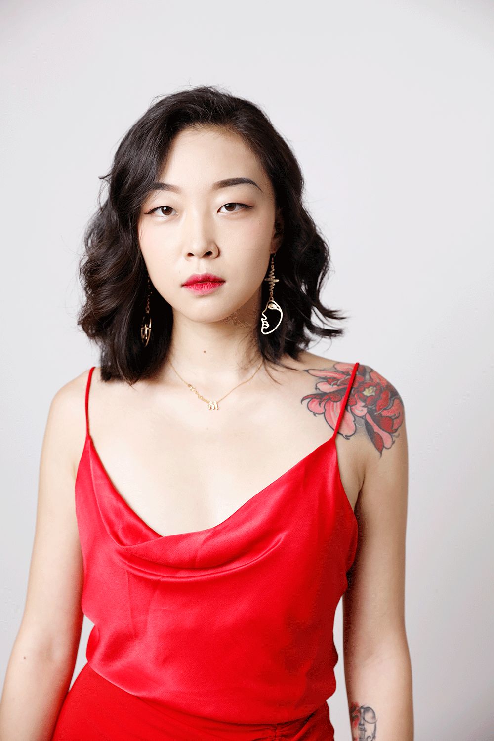秉持著less is more的法則,給密兒選擇了比普通背心更高級性感的、胸前垮垮的紅色吊帶背心,半身裙也有小心機,可以自己調整腰線位置,側邊抽繩的設計也很時髦,開衩部分若隱若現地露出腿部,