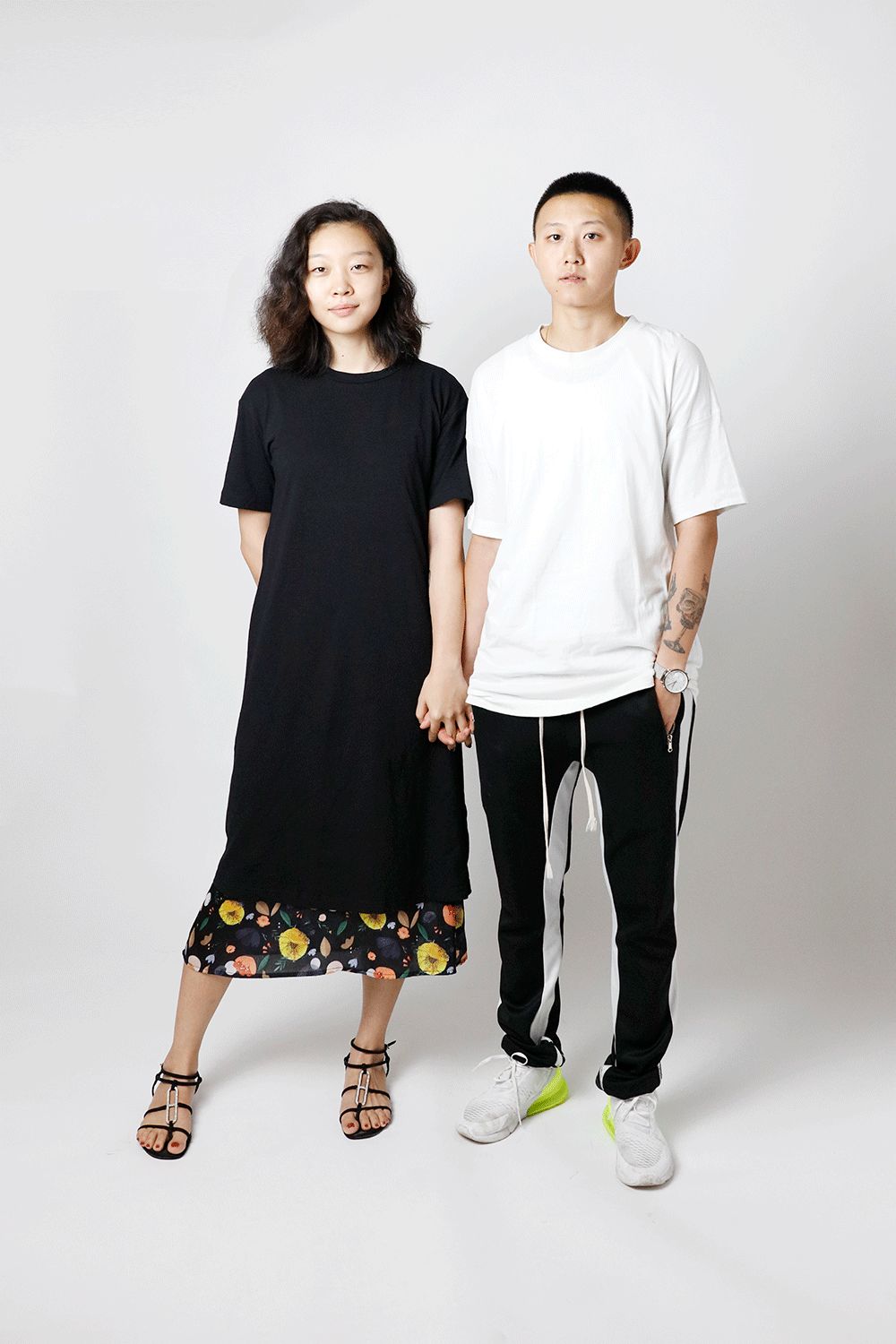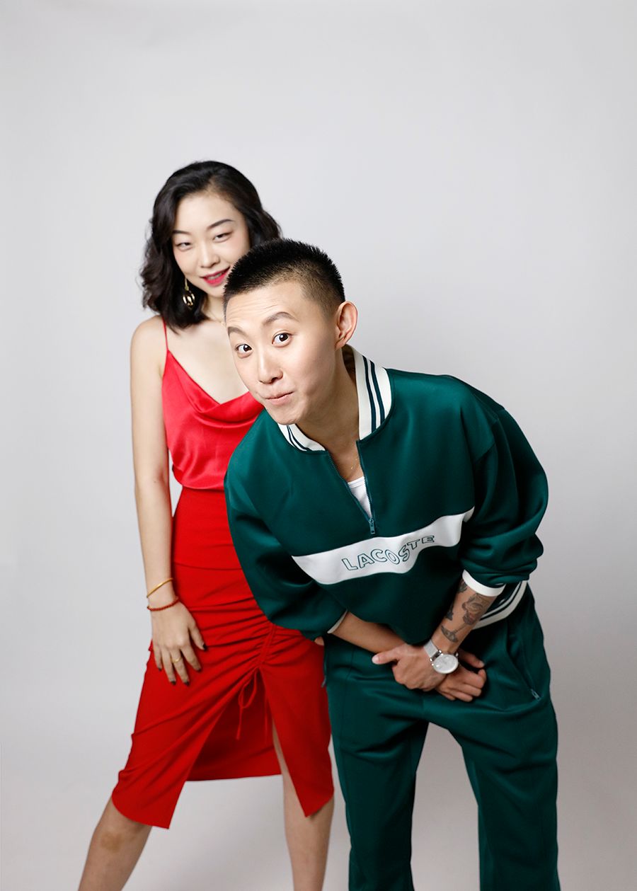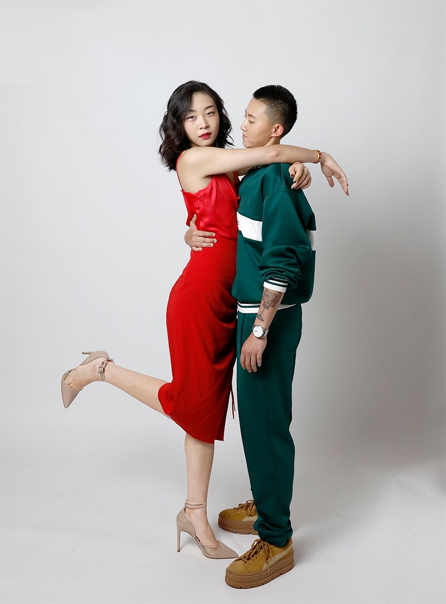 她們本身就反差很大,第二套我大膽地給她們來了個紅配綠,女人味和街頭風的碰撞,蠻有勁的。