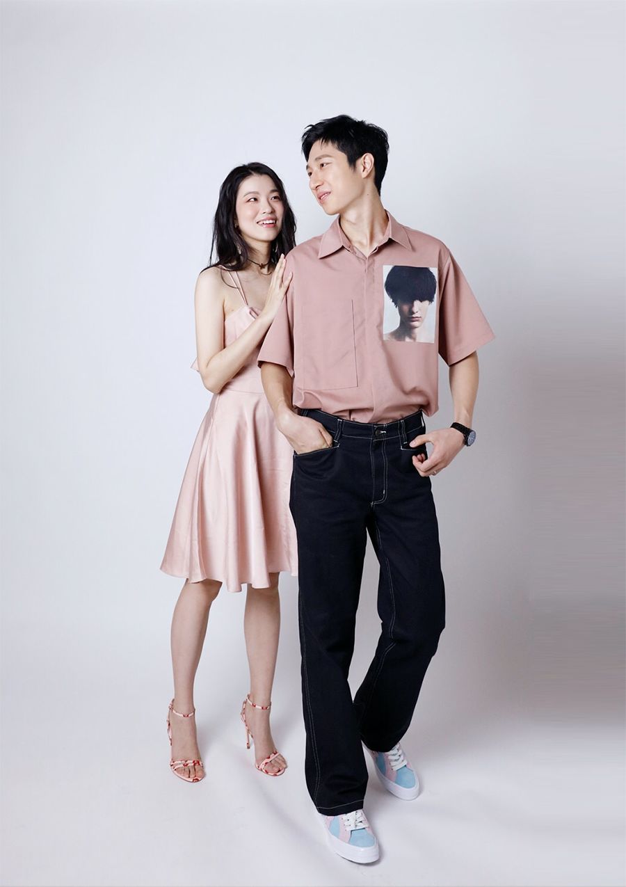 為了搭配老婆的裝束,選擇了同色系的頭像印花襯衫,生活中很多男生都不會選粉色的衣服,但明度較低的橡皮粉一點也不娘,反而很暖很靚。