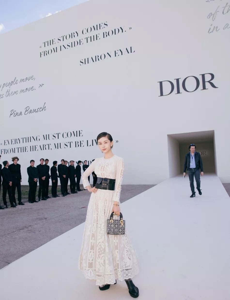 和baby一樣,王子文也受邀去了Dior秀場 。但裙子的顏色剛好相反,是一身帶黑色腰封的白色闊擺裙裝。
