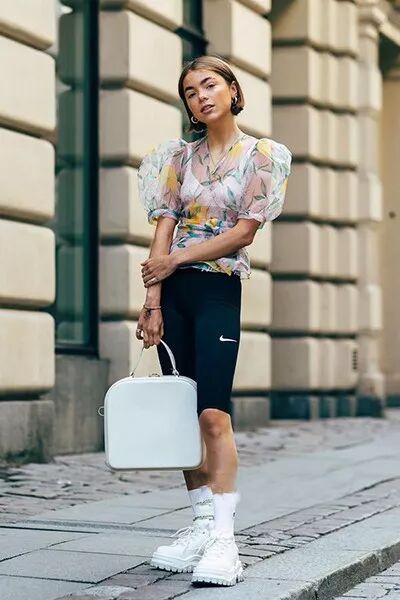 上寬下窄的穿衣在搭配自行車短褲時也同樣適用,這位博主就選擇了超級蓬鬆的公主袖露肩衫來搭配自行車短褲,看起來是不是很高級呢?