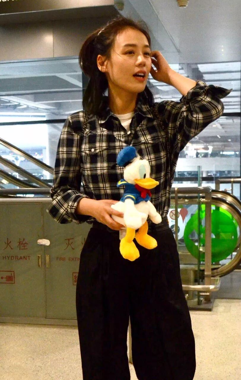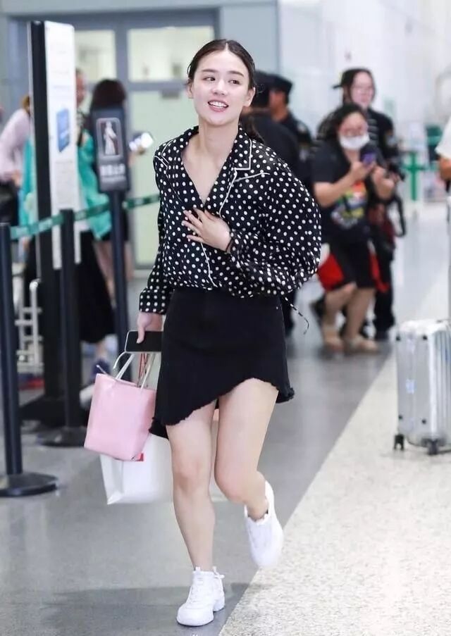 機場里跑的像一陣風,身穿波點上衣,搭配一條不規則半身裙,這姿勢也是沒誰了,機場好像女漢子。