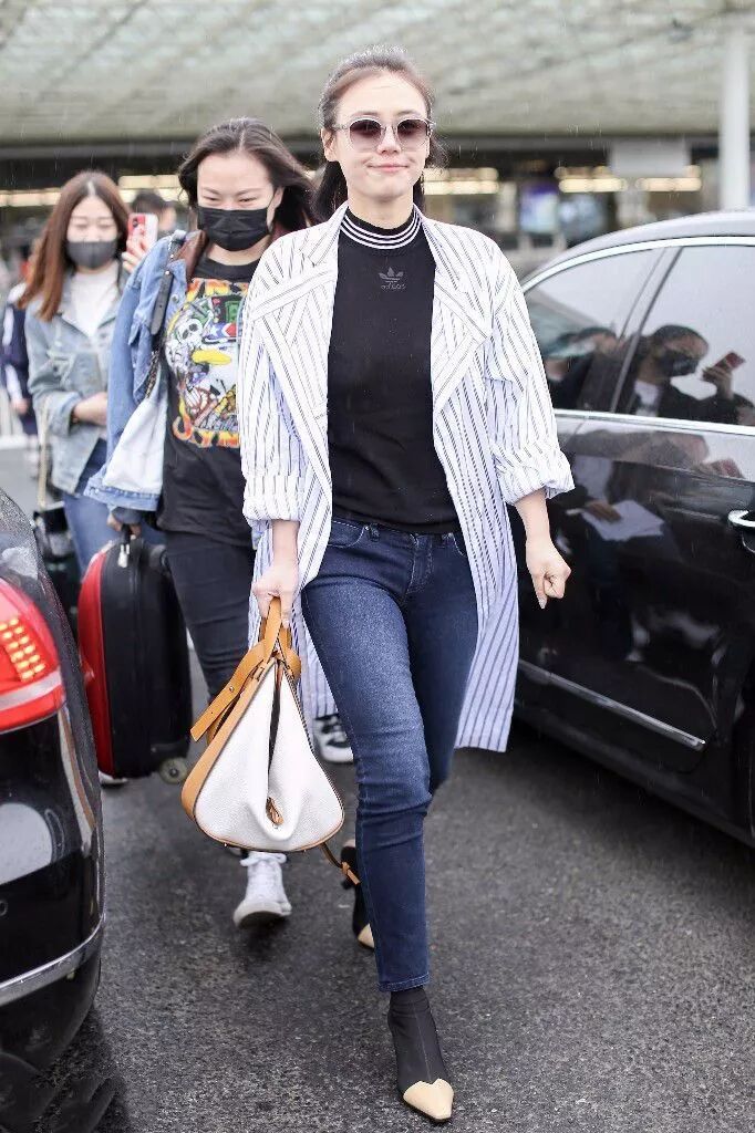 條紋外套,穿出高挑身材,同時搭配的藍色牛仔褲,看起來格外女神,腳上的鞋子,與襪子有一拼,看起來好氣質。