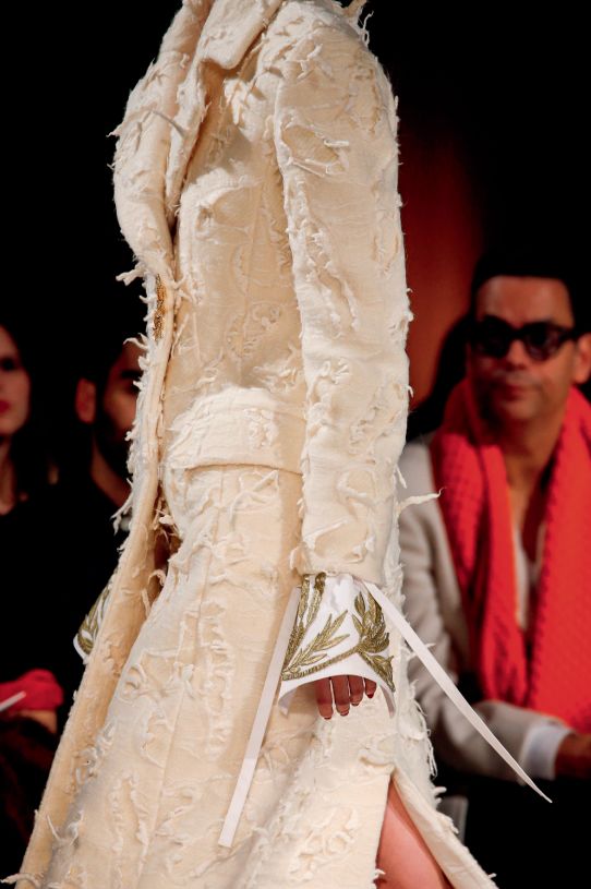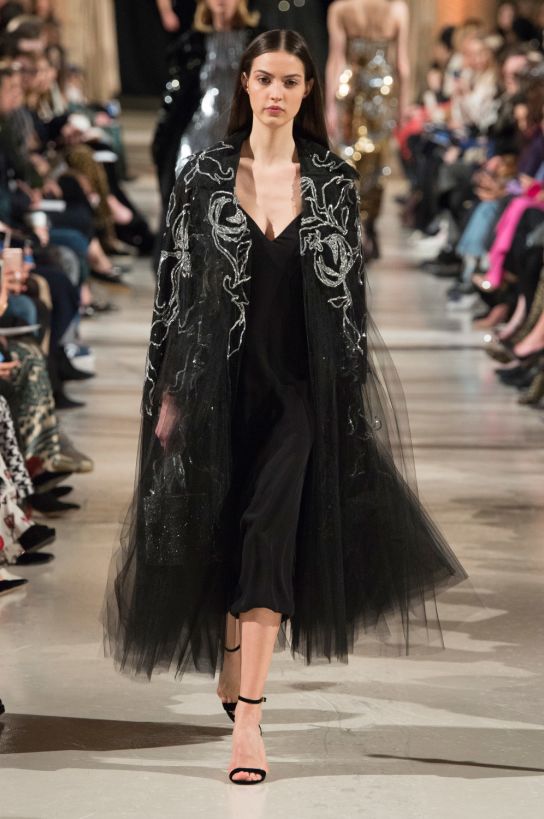F:這一季出現的合身魚尾裙是致敬Oscar先生經典的晚裝設計,而那些裝點在絲絨和絲綢裙裝上的花朵圖案與鑲嵌元素,則是受我與Oscar先生一次參觀Janet Cardiff聲像裝置的經歷啟發而來的,我用這些花枝狀的裝飾和印有樹枝圖案的錦織面料,去回顧那些與他一同經歷過的美好瞬間。