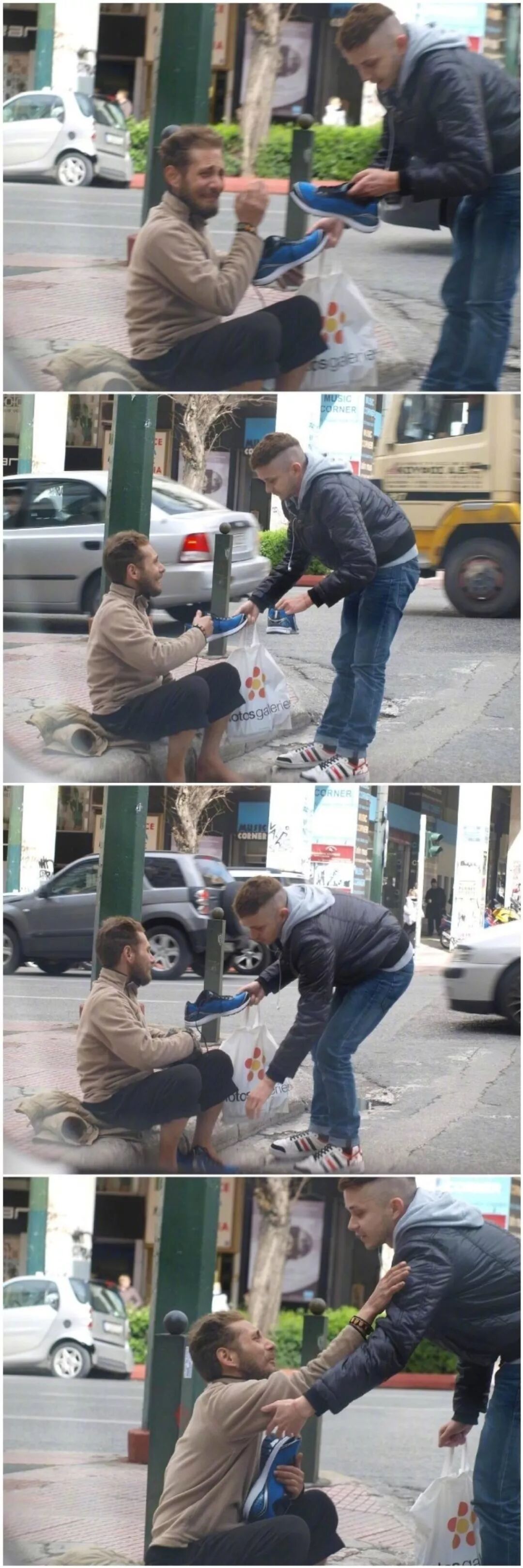 一個男孩為流浪漢買了一雙鞋