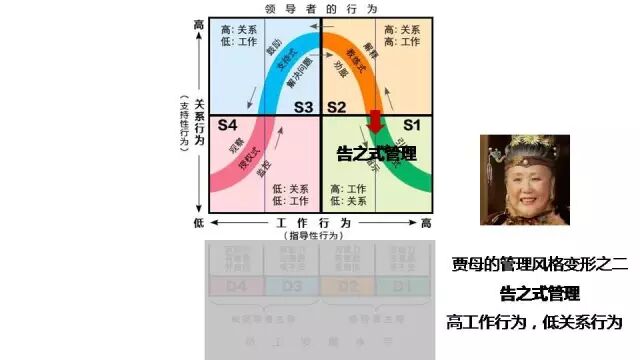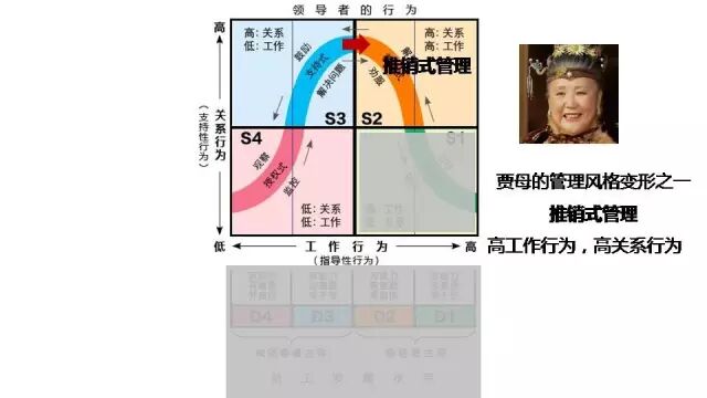 此時賈母的管理風格就變成了「高工作行為高關係行為」的「推銷型主管」:高工作行為——直接指出工作中具體存在哪些不足,高關係行為——耐心地解釋主管不作為的危害。