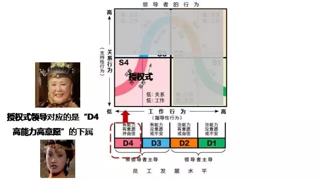 授權式主管對應的是「D4高能力高意願」的下屬,王熙鳳做事效率高,不怕出風頭,也擅長處理複雜的人際關係,一看就是「授權式主管」的不二之選。