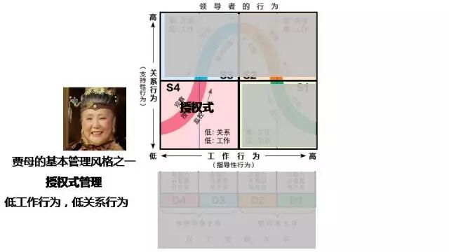 所以,該理論用這兩個維度把管理風格分為四類,有兩種是賈母的基本管理風格,第一種就是其中位於左下角的授權型主管風格:低指導行為——放手讓下屬處理,不過問具體事務;低關係行為——賈母更多表現出奶奶和孫媳婦的家庭關係,而不是職場的上下級關係。