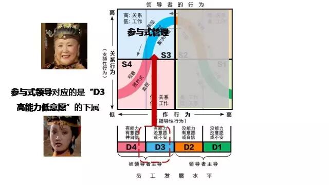 所以,「參與型主管」對應的是D3型下屬——高能力低意願。賈母從「授權型主管」切換成「參與型主管」,往往是因為王熙鳳心態的變化。