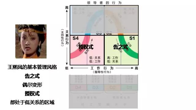 一個經驗不足的新晉主管總是像王熙鳳一樣,在兩種「低關係」管理模式中徘徊,甚至會出現兩種極端情況:一部分工作直接推給下屬,完全不聞不問(過度授權型),另一部分工作全部攬在自己身上,把下屬變成執行機器(過度告之型)。