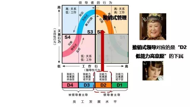 「推銷型主管」對應的是D2型下屬,低能力高意願,主管不但要用「高工作行為」指導他們具體怎麼做,更要用「高關係行為」保護他們的工作積極性。
